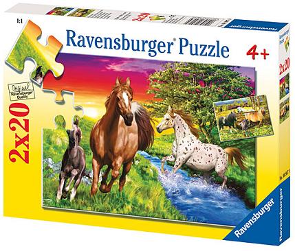 Ravensburger Puzzle Świat Koni 2 x 20 oferują doskonałą jakość kawałek po kawałku. Puzzle Świat Koni umożliwiają ułożenie aż 2 obrazków. Każdy z nich składa się z 20 elementów i przedstawia galopujące konie w na tle malowniczych krajobrazów. Ponadto poprzez zabawę z puzzlami dzieci ćwiczą wyobraźnię przestrzenną i rozwijają umiejętności manualne.