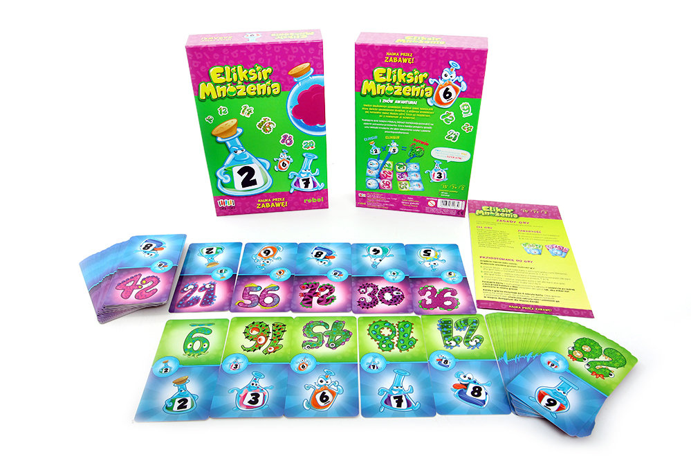 - kolorowe karty, atrakcyjny temat i przyjemna oprawa graficzna z pewnością spodobają się najmłodszym uczestnikom zabawy i sprawią, że chętnie będą wracali do Eliksiru mnożenia. Tym samym łatwiej będzie przemycić zawarte w grze elementy edukacyjne, a nauka będzie odbywała się w pewnym sensie mimowolnie