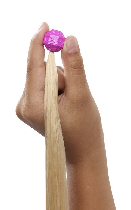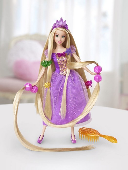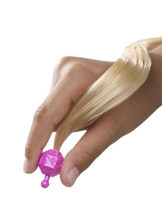 Złociste loki na włosach Roszpunki wydają się ciągnąć w nieskończoność.... gdyż mają długość prawie jednego metra! Dziewczynki mogą aż tak je wydłużyć dołączając oba "przedłóżenia" w kolorze blond znajdujące się w zestawie. Lalka ubrana jest w różowo-złotą suknię księżniczki, ma złotą szczotkę do włosów oraz cztery oryginalne spinki (w kształcie Pascala, słońca i kwiatów). Dziewczynki mogą bawić sie w upinanie fryzur, jakie zapamiętały z filmu. Lalka nie stoi samodzielnie.