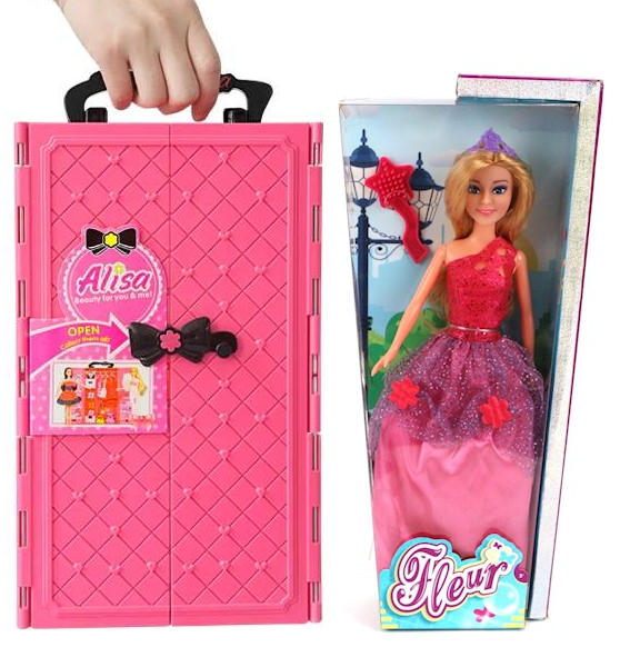Zestaw zawiera różową szafę z dwoma otwieranymi skrzydłami. Wreszcie piękne kreacje laleczki będą uporządkowane w szafie. Szafa posiada liczne półeczki, na których możesz wyeksponować modne buciki i akcesoria. We wnętrzu szafy znajduje się uchwyt, na którym można powiesić sukienki na wieszakach. Szafa posiada zamykane drzwiczki i uchwyt do przenoszenia, dzięki czemu szafę bez problemu można transportować w inne miejsce. Po otwarciu szafy na prawym jej skrzydle znajduje się toaletka z lusterkiem, a po lewej stronie dwa dodatkowe uchwyty na ubrania. Dodatkowo w zestawie znajdują się dwie sukienki oraz liczne akcesoria takie jak: 3 pary butów, 3 torebki, 6 wieszaków na ubrania. Szafa posiada uchwyt oraz zapięcie w kształcie kokardki, dzięki czemu łatwo można ją przetransportować.