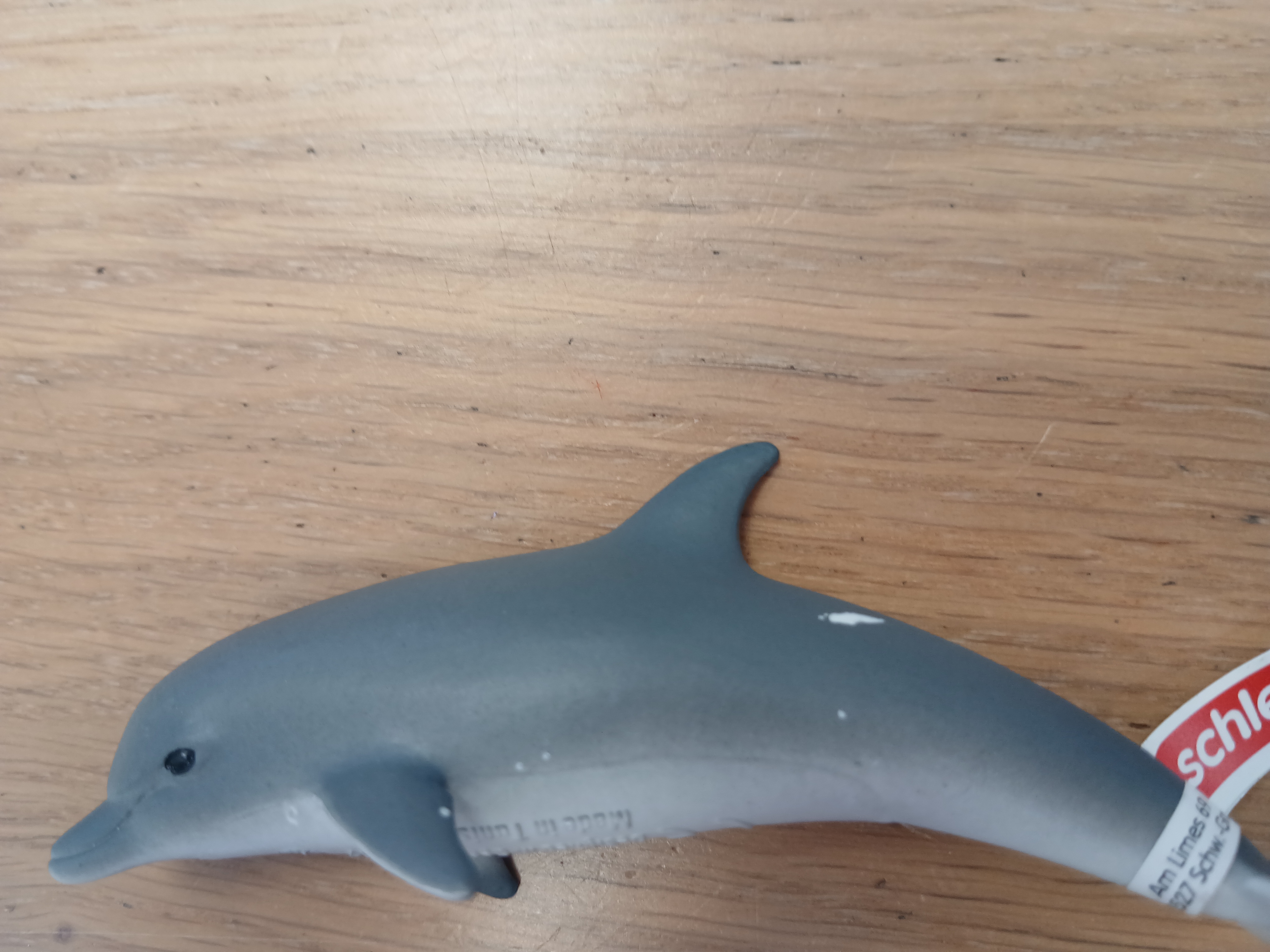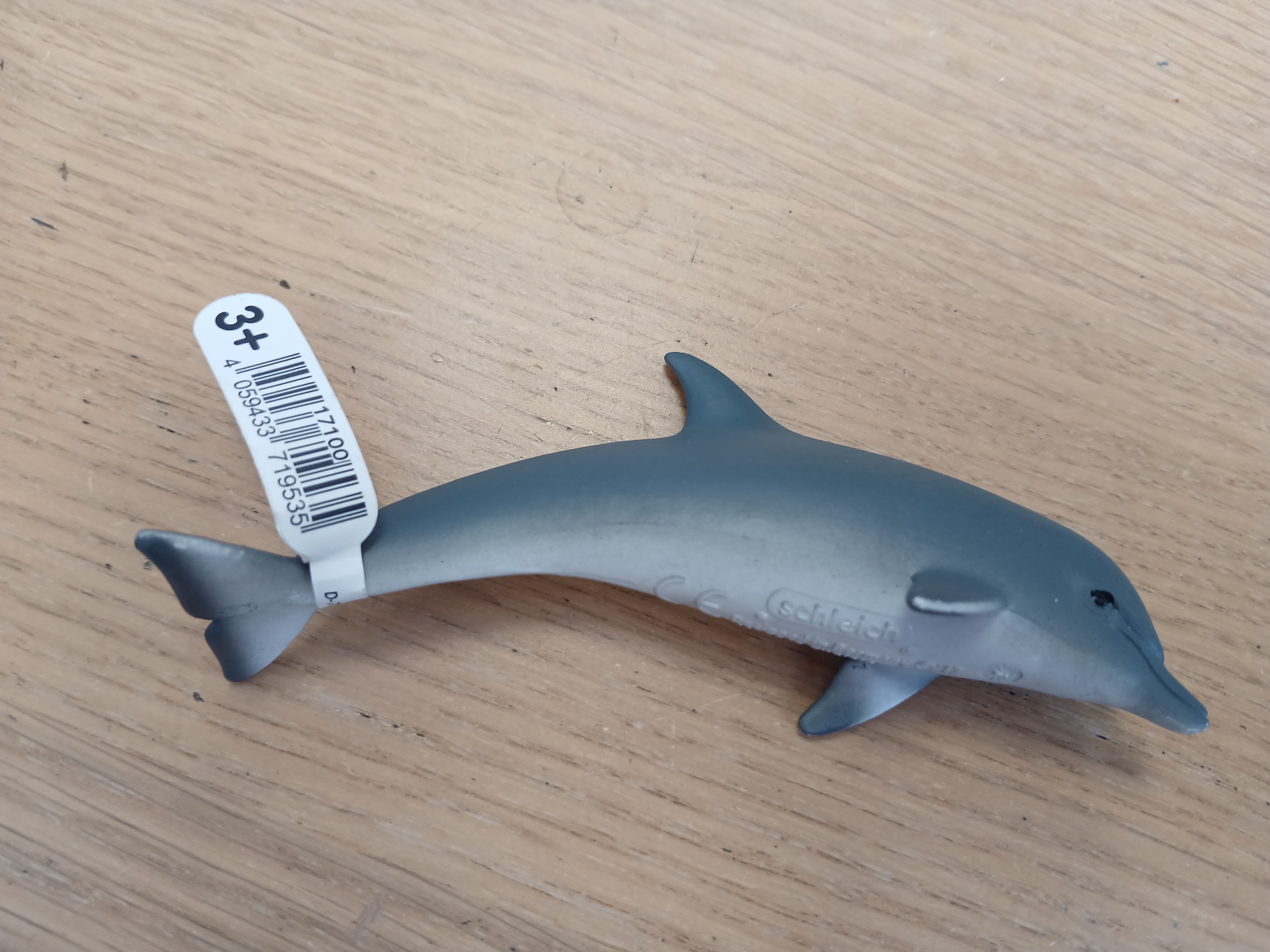 Schleich Delfin 17100 to ręcznie malowana i precyzyjnie wykonana figurka kolekcjonerska z serii Dzikie Zwierzęta. Delfin ma szarawe ubarwienie. Zamieszkuje morza obu półkul i wiele rzek strefy równikowej. Delfiny są szybkimi i zwinnymi pływakami, często efektownie skacząc po powierzchni wody. Pod wodą wydają wysokie, gwiżdżące i klikające dźwięki, które tworzą echo. W ten sposób orientują się i tropią zdobycz. Delfiny są bardzo towarzyskie i często szukają fizycznego kontaktu z rodziną.