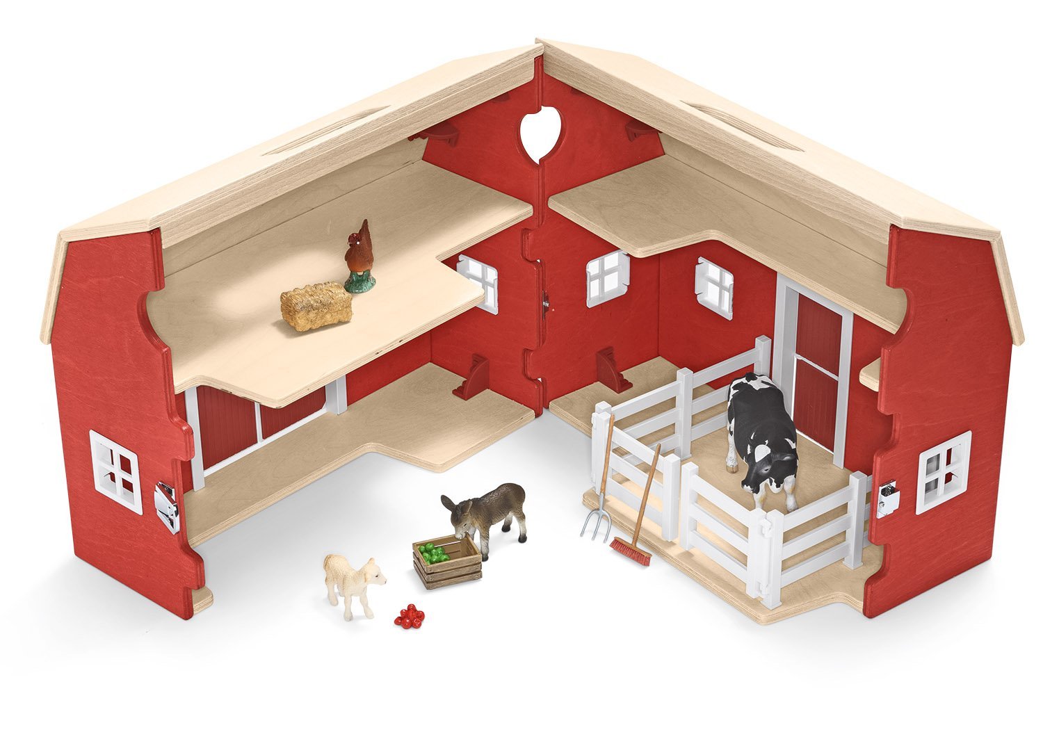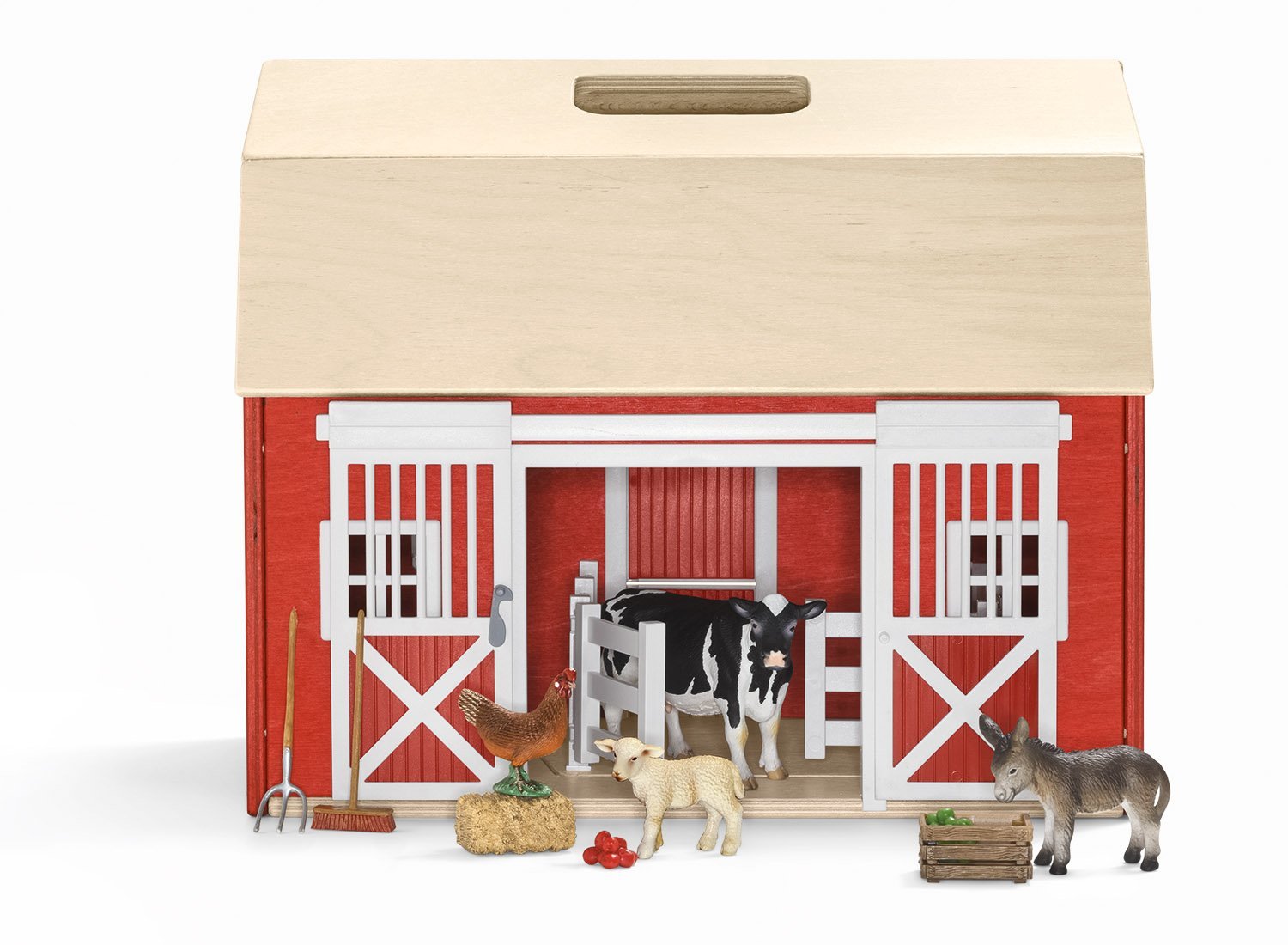 Schleich Przenośna stodoła 42170 zawiera podwójne rozsuwane duże wrota, drzwi, zagrodę i okienka. Wygodny uchwyt w górnych częściach dachu pozwala na swobodne jej przenoszenie i zabawę z przyjaciółmi w dowolnym miejscu. Możliwość rozkładania stwarza dodatkową przestrzeń do zabawy. Obszerne wnętrze stodoły pomieści również dodatkowe zwierzęta z farmy Schleich.