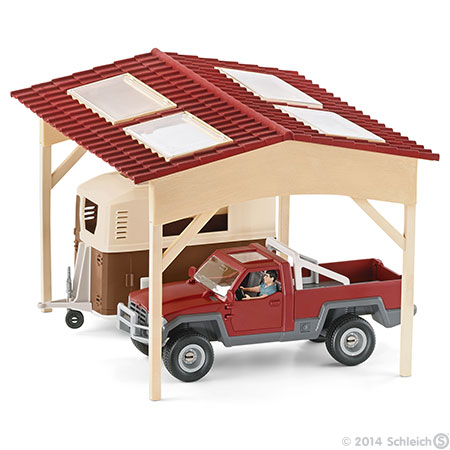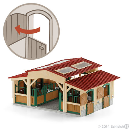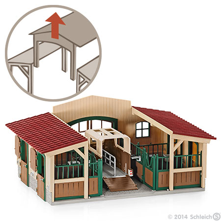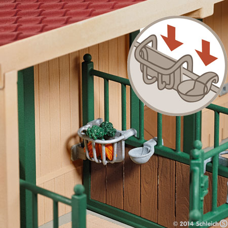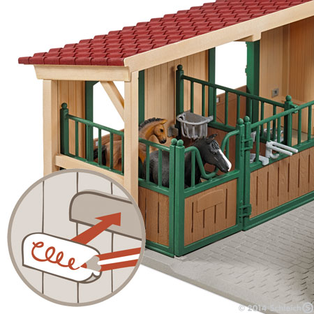 Schleich Końska zagroda 42110 to precyzyjnie wykonana zagroda z serii Zwierzęta Gospodarskie. Teraz dzięki akcesoriom Schleicha mali miłośnicy przyrody mogą samodzielnie opiekować się zwierzętami, nie ruszając się z domu. Zagroda wykonana jest z wysokiej jakości tworzywa sztucznego. Elementy zagrody można połączyć bez stosowania dodatkowych narzędzi, a zdejmowany dach ułatwi sprzątanie stajni.