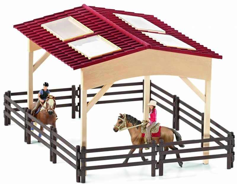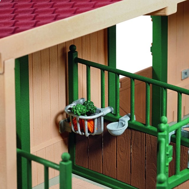 Schleich Końska zagroda z akcesoriami 42103 to precyzyjnie wykonana zagroda z serii Zwierzęta Gospodarskie. Teraz dzięki akcesoriom Schleicha mali miłośnicy przyrody mogą samodzielnie opiekować się zwierzętami, nie ruszając się z domu. Zagroda wykonana jest z wysokiej jakości tworzywa sztucznego. Elementy zagrody można połączyć bez stosowania dodatkowych narzędzi, a zdejmowany dach ułatwi sprzątanie stajni.
