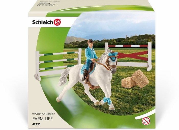 Schleich Zestaw konkursowy 42190 to ręcznie malowana i precyzyjnie wykonana figurka kolekcjonerska z serii Ludzie. Jeździec ubrany w profesjonalny strój konkursowy gotowy jest wygrać kolejne zawody. Razem z Jeźdźcem w zestawie znajduje się kompletny zestaw z przeszkodami i stogami słomy. Składa się on z siodła, czapraka, uzdy. Dzięki tym elementom koń będzie doskonale przygotowany do jazdy.