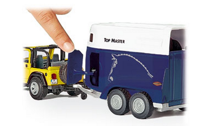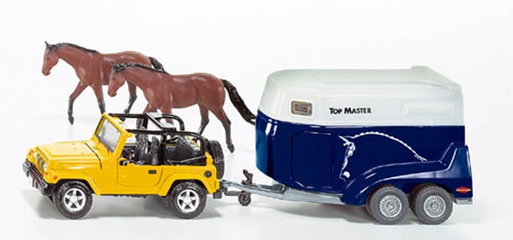 Siku Jeep z przyczepą do przewozu koni 4670 wykonany w skali 1:32 z najwyższej jakości metalowych i plastikowych elementów. Gumowe opony zapewniają swobodne poruszanie po różnych powierzchniach. Zestaw zawiera dwie figurki konia wykonane z twardej gumy. Jeep ze specjalną przyczepą to doskonała zabawka dla najmłodszych i atrakcyjny model kolekcjonerski.