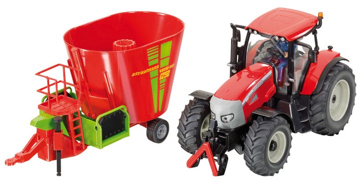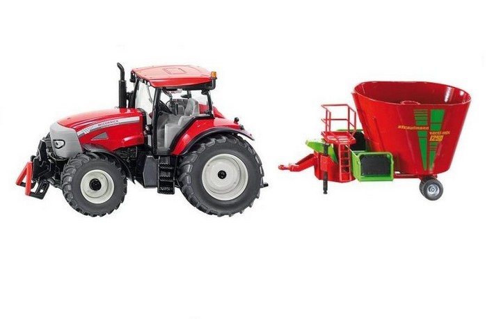 Siku Traktor McCornick z Mieszalnikiem 8611 z serii Siku FARMER wykonany został z najwyższej jakości metalowych i plastikowych elementów z dbałością o każdy szczegół. Wszystko po to by jak najbardziej przypominał oryginalny pojazd. Siku Traktor McCornick to wielozadaniowy traktor. Traktor posiada w pełni ruchome gumowe koła, podnoszoną osłonę silnika oraz hak do którego można podczepić przyczepę. W zestawie znajduje się specjalistyczna przyczepa do mieszania paszy. Niecodzienny wygląd czyni z tego modelu ciekawy okaz w każdej kolekcji pojazdów.