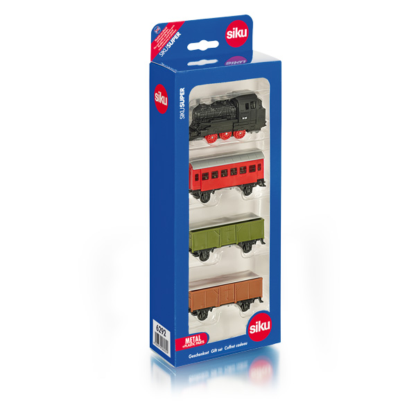 Siku Zestaw Kolejowy 6292 to atrakcyjny komplet 4 modeli w jednym opakowaniu. Zestaw kolejowy jest ciekawym pomysłem na prezent nie tylko dla najmłodszych kolekcjonerów. W pudełku znajduje się lokomotywa, 2 wagony towarowe i jeden pasażerski. Można je z łatwością połączyć ze sobą tworząc niewielki skład kolejowy. Każdy model wykonany jest z ogromną precyzją przy odwzorowaniu szczegółów rzeczywistej konstrukcji.