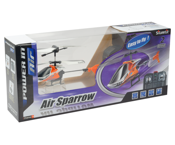 Air Sparrow to wyjątkowo wytrzymały i stabilny model. Posiada dwa pełne kanały sterowania co oznacza, że może latać góra/dół i wykonywać obroty prawo/lewo. Helikopter ładowany jest z pilota. Dzięki świecącym diodą helikopter będzie widoczny również w ciemnych pomieszczeniach. Małe, bezpieczne rozmiary czynią Air Sparrow doskonałym śmigłowcem do lotów w domu.