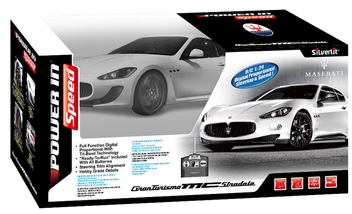 Silverlit Maserati Gran Turismo w skali 1:24 to precyzyjnie i starannie wykonany model, który wygląda dokładnie jak jego duży odpowiednik. Sterowany przy pomocy pilota radiowego o częstotliwości 27 MHz dokładnie wchodzi w zakręty i przyśpiesza.