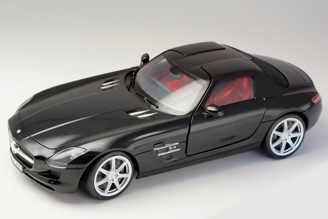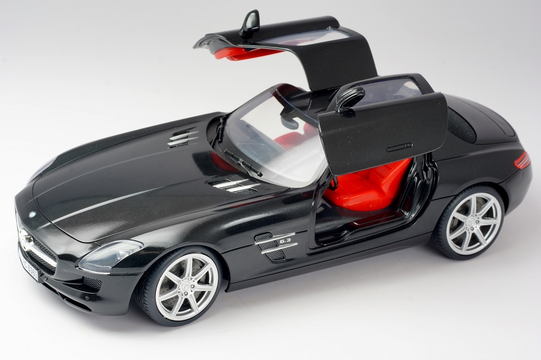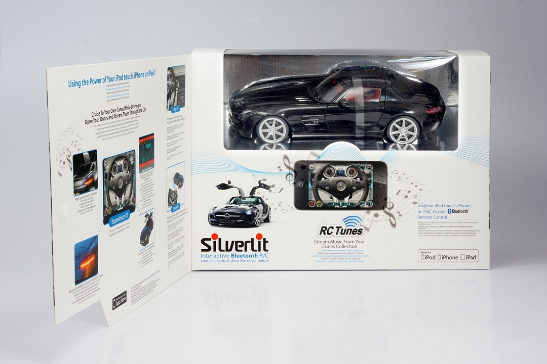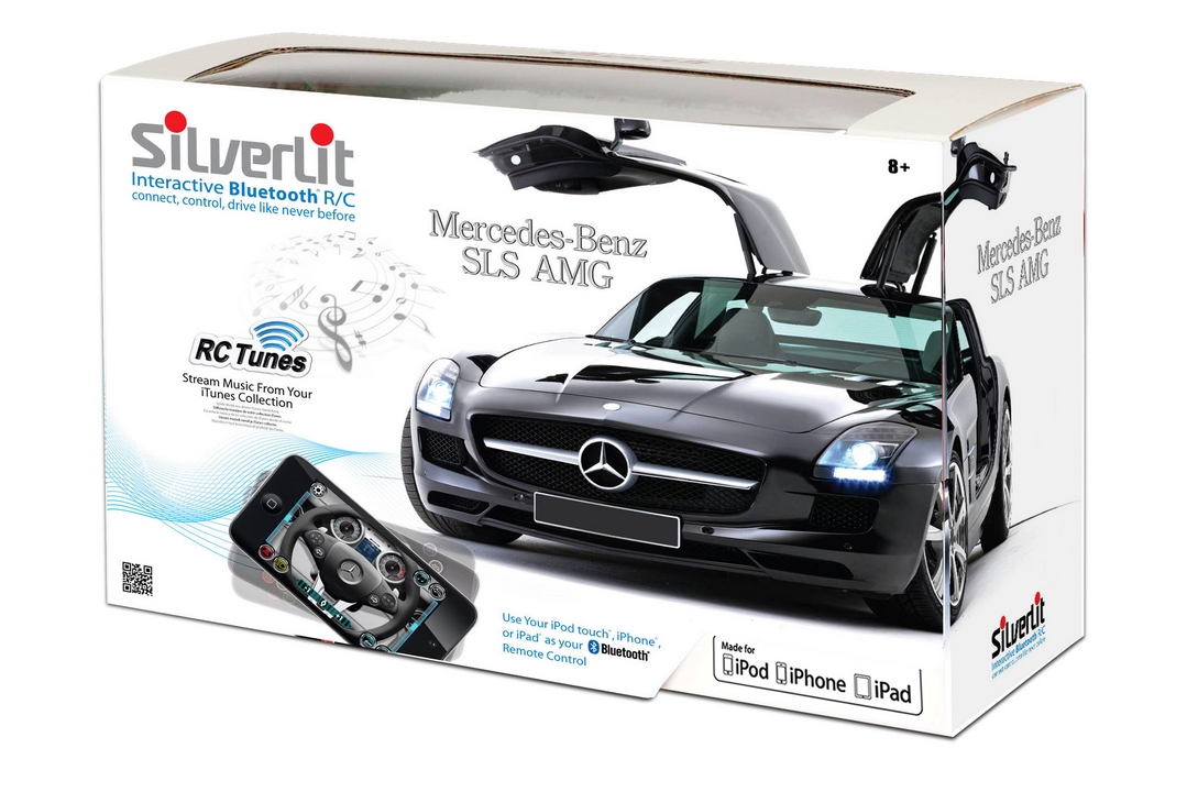 Mercedes Benz SLS AMG w skali 1:16 to precyzyjnie i starannie wykonany model, który wygląda dokładnie jak jego duży odpowiednik. Sterowany jest przy pomocy iPoda, iPada albo iPhona. Model może jeździć przód-tył i lewo-prawo. By zabawa była bardziej realistyczna Mercedes wyposażony został w efektowne przednie światła LED, kierunkowskazy i światła stopu. Posiada również otwierane drzwi, które otwierają się i zamykają zdalnie. Posiada podświetlaną deskę rozdzielczą. Mercedes posiada wbudowany głośnik, dzięki czemu mamy możliwość słuchania muzyki z naszej kolekcji iTunes podczas jazdy.