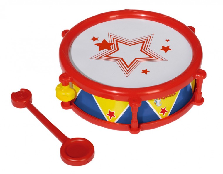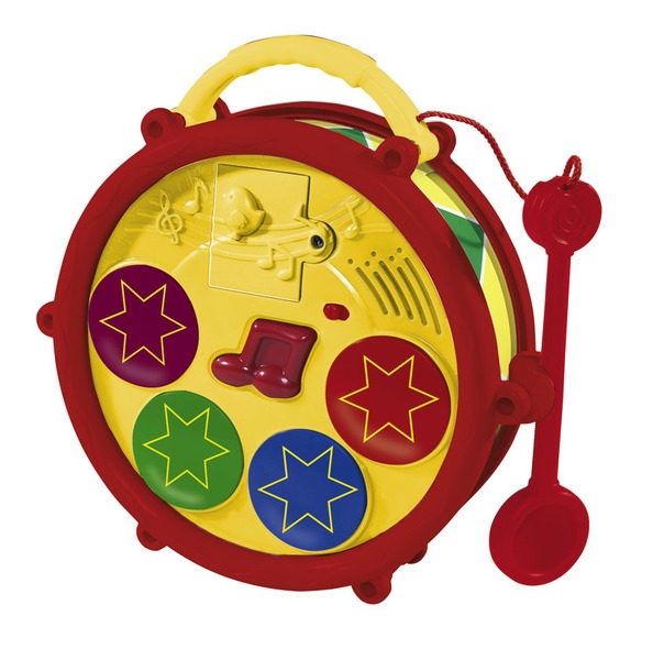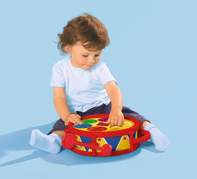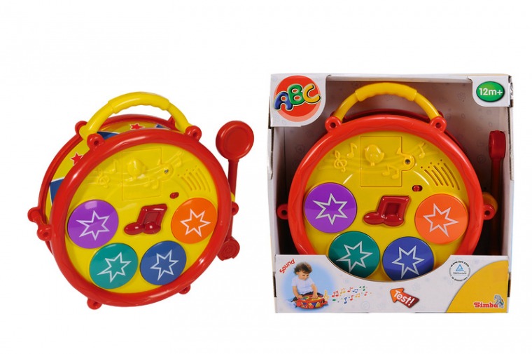 Bębenek Malucha ABC z jednej strony posiada przyciski, które wygrywają melodię, a z drugiej strony istnieje możliwość uderzania pałeczką.