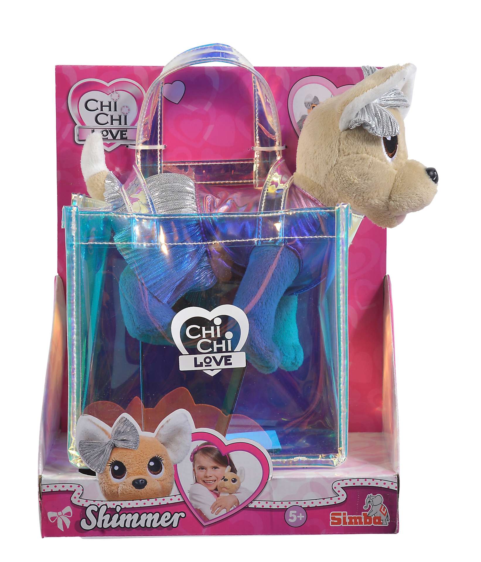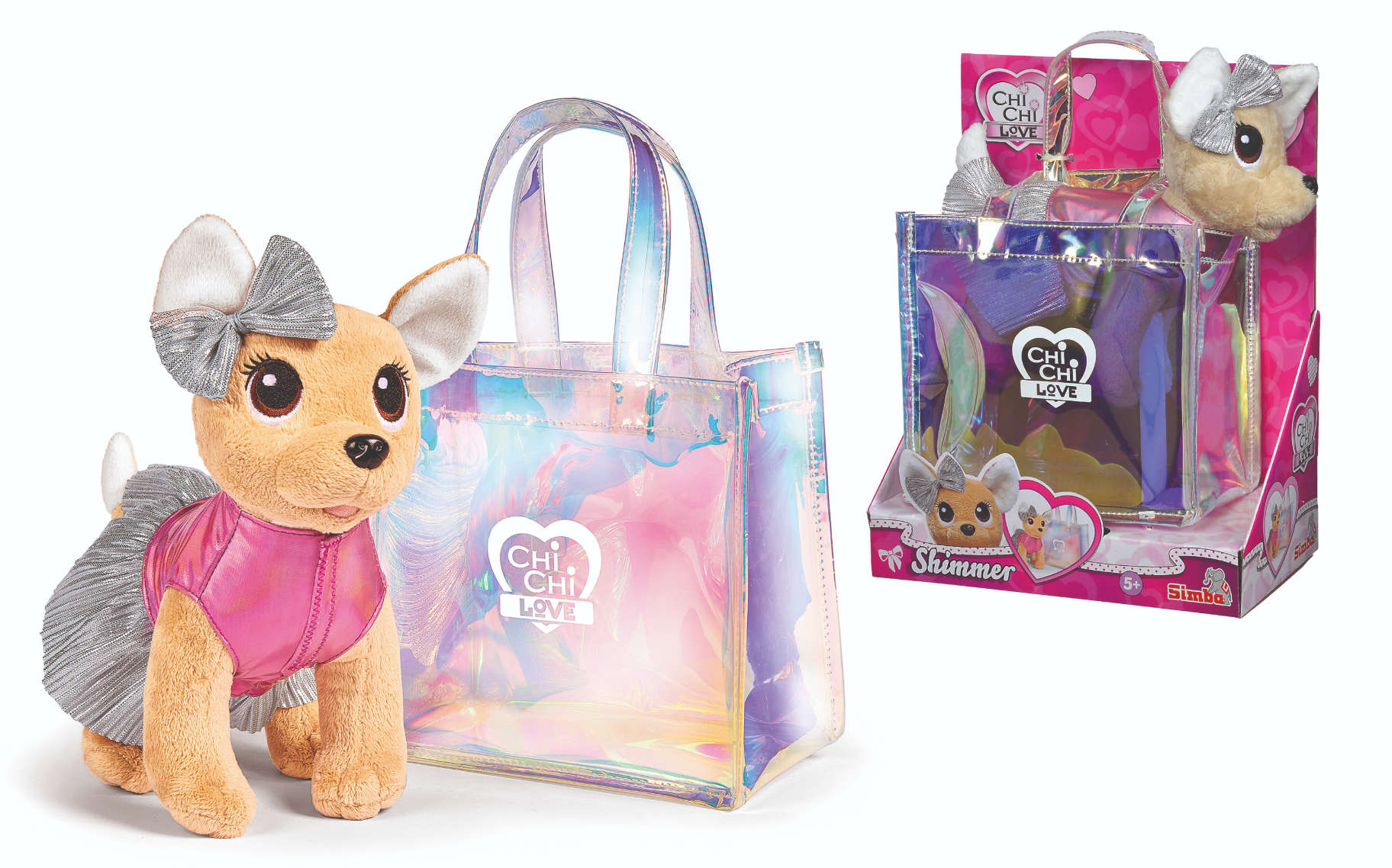 Piesek z uwielbianej przez dzieci serii Chi Chi Love z śliczną, lśniącą torebką to idealna zabawka dla małych miłośniczek piesków i mody. Chihuahua jest milutka w dotyku i nie sposób powstrzymać się by jej nie pogłaskać. Na uszku ma piękną srebrną kokardkę i ubrana jest w błyszczący, modny strój: różową bluzeczkę i srebrną spódniczkę. Największym hitem jest holograficzna, transparentna torebka.