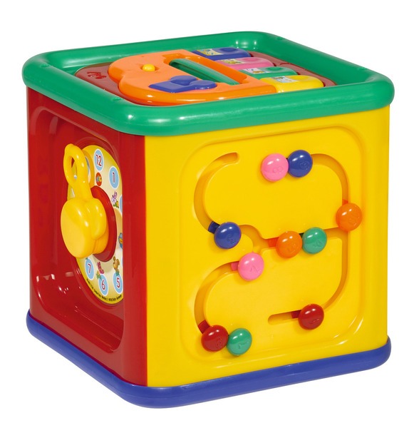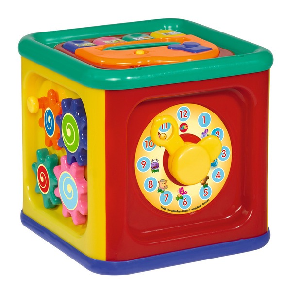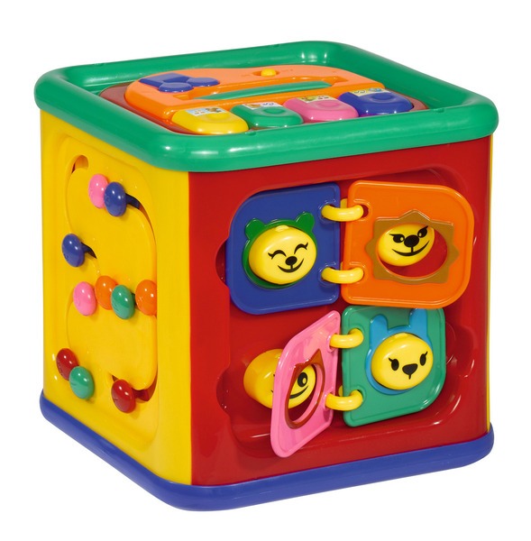 Kostka Wielofunkcyjna to zestaw łączący kilka zabawek w jednej kostce: zabawny zegar, telefon ze słuchawką, pianino, obracające się zwierzątka, książeczka z ruchomymi stronami, labirynt kulek.