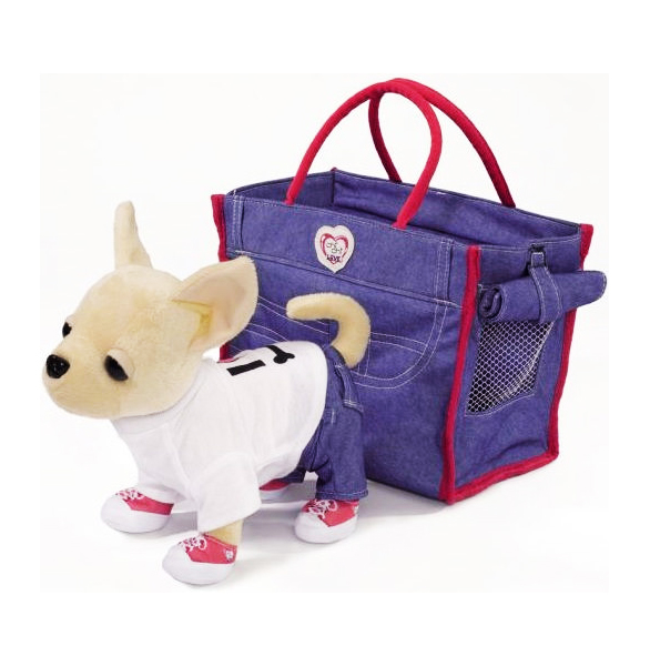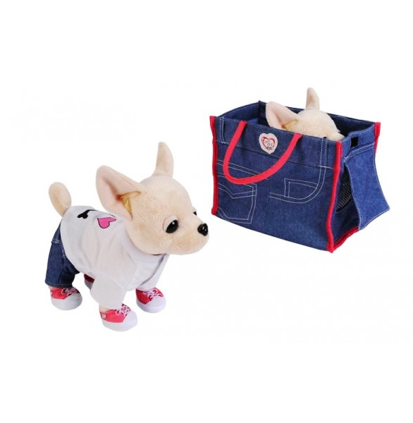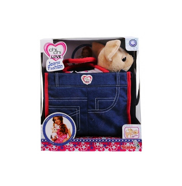 Prezentowany model to Chi Chi Jeans w Torbie. Piesek nosi jeansy, koszulkę z napisem oraz kultowe trampki które z pewnością przykują uwagę każdego. Ubranka Chi Chi love and friends można zdejmować i wymieniać. Ponadto w zestawie znajduje się torba w której można schować pieska gdy jest mu zimno.