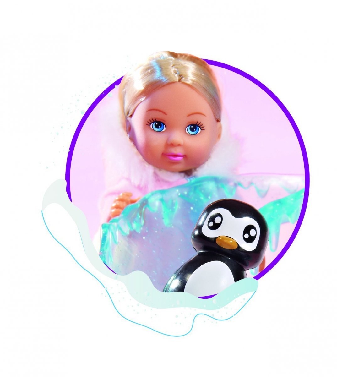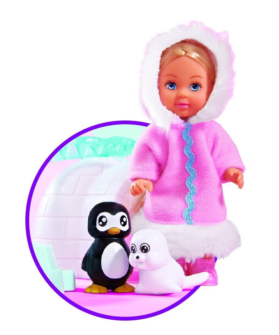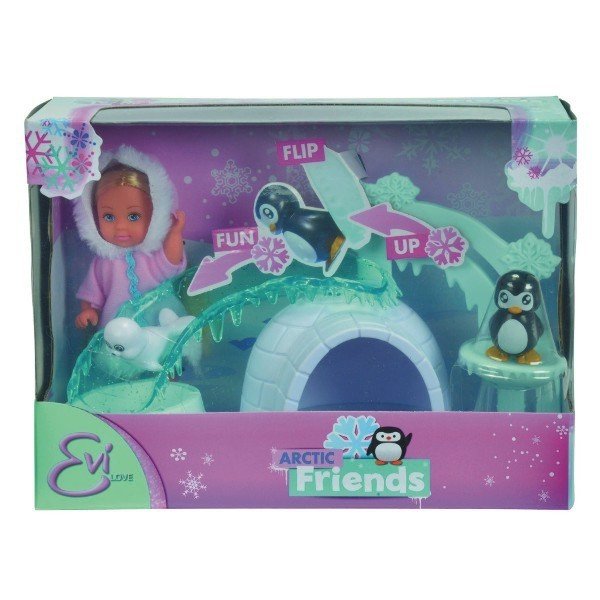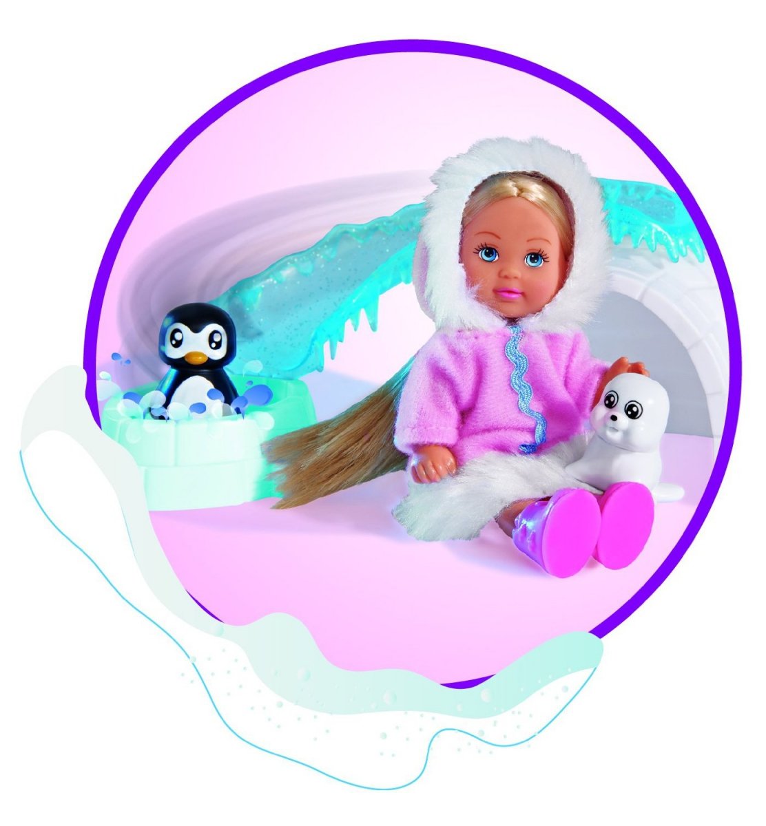 Lalka Evi w stroju zimowym wybrała sie na arktyczną przygodę. Towarzyszą jej wesoły pingwinek i urocza foczka. W zestawie znajduje się także iglo ze zjeżdżalnią.