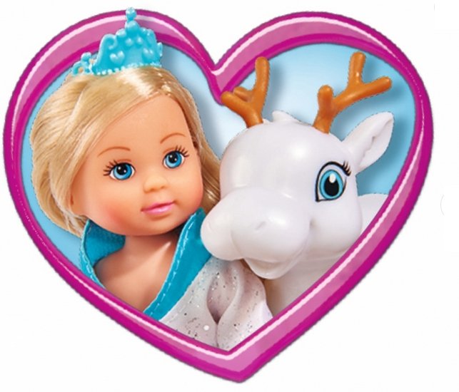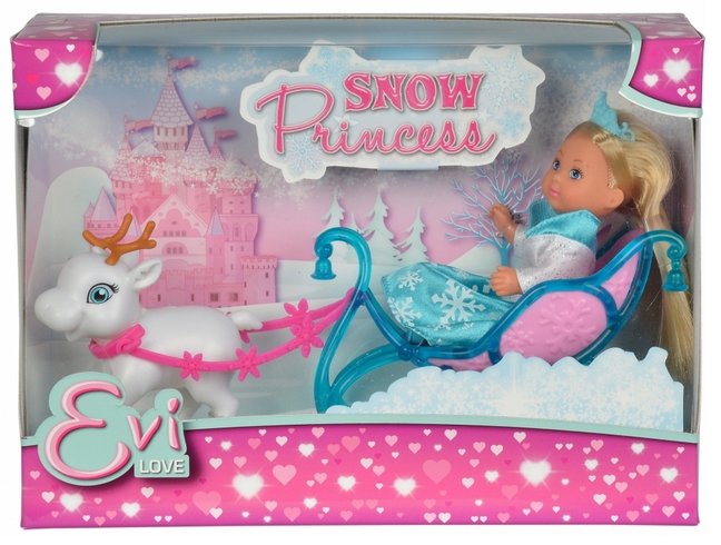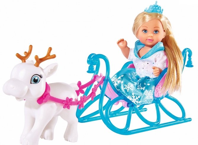 Lalka Evi postanowiła wybrać sie na przejażdżkę w ślicznej zimowej karecie zaprzężonej do białego Renifera. Evi ma na sobie błyszczącą biało-błękitną suknię, ozdobioną śnieżynkami,a jej głowę zdobi błękitna korona.