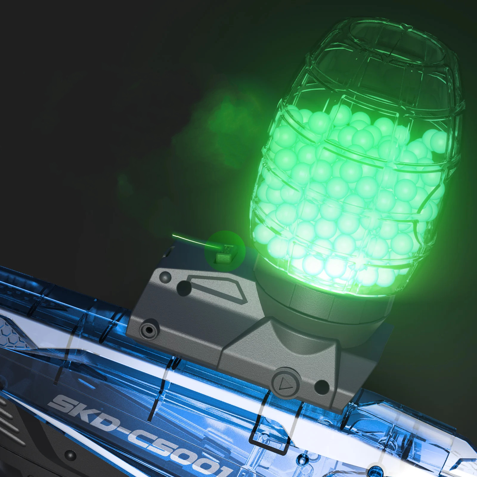 Nowy wymiar bitew! SKD Blaster CS-0001 posiada podświetlane gniazdo na magazynek, a w zestawie otrzymasz dodatkowo 500 kulek żelowych świecących w ciemności! Zdobądź przewagę nad przeciwnikami w ekstremalnych warunkach! Dzięki podświetlanemu magazynkowi nawet w ciemności będziesz w stanie na bieżąco kontrolować stan swojej amunicji, a podczas oddawania strzału będzie widoczna poświata od święcących kulek. Nic Cię nie zaskoczy - wygraną masz w kieszeni!