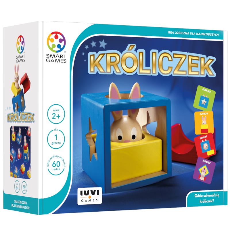 Poznaj ,,Króliczka" - wyjątkową grę, dzięki której Twoje dziecko w prosty, przyjemny sposób, pozna i zrozumie pojęcia takie jak: wewnątrz - na zewnątrz, po lewej - po prawej i inne. Rozwiązując 60 zadań o narastającym poziomie trudności,najmłodsi udoskonalą swoje zdolności manualne i umiejętność logicznego myślenia. Dzięki cieszącemu oko wykonaniu, granie będzie samą przyjemnością!
