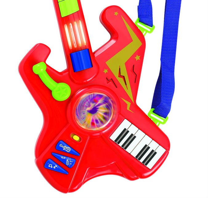 Instrument rozwija zdolności muzyczne dziecka, uczy rozpoznawania dźwięków, tworzenia własnych melodii, a wszystko to podczas fantastycznej zabawy. Dzięki niezwykłym funkcjom interaktywnym takim jak: melodie znane i lubiane, tryb demo, dogrywki, pianinko, gitara rozwija słuch i zdolność muzyczne maluchów. Aby dziecko mogło bawić się nie przeszkadzając przy tym rodzicom, zabawkę wyposażono w regulacją głośności. Gdy ”mały muzyk” przestanie bawić się gitara samoczynnie wyłączy się, przechodząc w tryb oszczędzania baterii. Na środku gitary znajduję się wirujący element ze światełkami.
