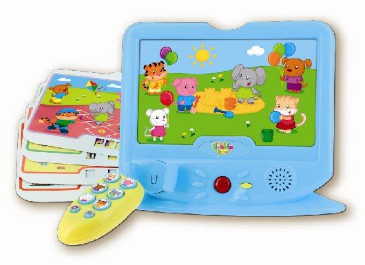 Interaktywny telewizor z pilotem to idealna zabawka do nauki. Zabawka jest dwujęzyczna, mówi zarówno po polsku jak i po angielsku. Telewizorek zadaje pytania odnośnie aktualnie włożonej planszy z obrazkiem, a udziela się odpowiedzi wciskając odpowiedni przycisk ze zwierzątkiem na obrazku.