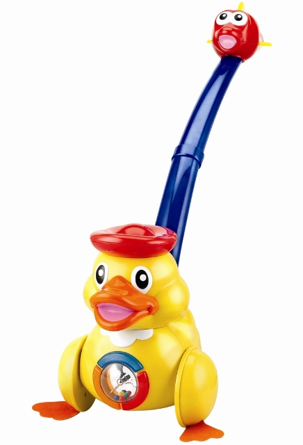 Kaczorek Kwak to zabawka do pchania z dźwiękami. Posiada na brzuszku grzechotkę wypełnioną kolorowymi kuleczkami oraz trzy przyciski funkcyjne, które uruchamiają 3 wesołe melodie. Podczas pchania jego małe nóżki wprawiane są w ruch doskonale imitując poruszającą się prawdziwą kaczkę. Plastikowa, sztywna składana i solidna rączka jest bardzo wygoda w użytkowaniu przez bawiące się dziecko.