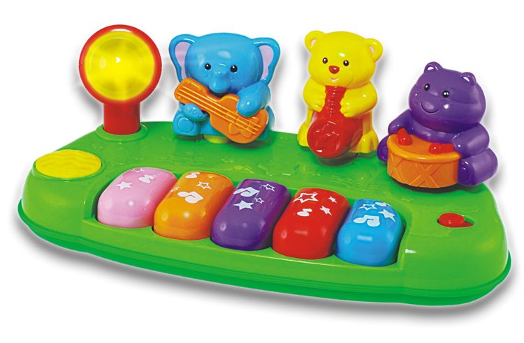 Smily Play Kapela z Zoo 2012 to bardzo kolorowa zabawka dźwiękowa dla dzieci już od 12 miesięcy. Pianinko z dużymi kolorowymi przyciskami, przystosowanymi dla małych jeszcze nieporadnych rączek. Na pianinku siedzą: niebieski słonik z gitarą, misio z saksofonem i hipcio z bębenkiem. Ruchome zwierzątka są przystosowane do poruszania przez dziecko, wydając za każdym razem wesoły dźwięk lub śmiech zachęcający do zabawy. Pianinko posiada efekt świetlny! Mikrofon podświetla się po naciśnięciu dowolnego przycisku.