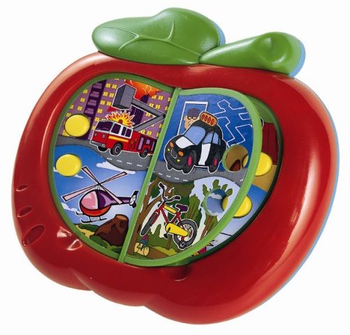 Smily Play Książeczka Jabłuszko to edukacyjna książeczka w kształcie jabłka, która idealnie nadaje się dla każdego maluszka. Na pierwszej stronie znajdują się 4 obrazki, a znajdujące się obok nich żółte przyciski uruchamiają odpowiadające im dźwięki: odgłos syreny strażackiej, policyjnej, helikoptera oraz dzwonka roweru. Gdy dziecko przewróci plastikową stronę książeczki zobaczy kotka, ptaszka, pieska i kaczorka. Znajdujące się obok zwierzaków przyciski analogicznie uruchamiają odpowiadające obrazkom odgłosy: miauczenie, szczekanie, ćwierkanie i kwakanie.