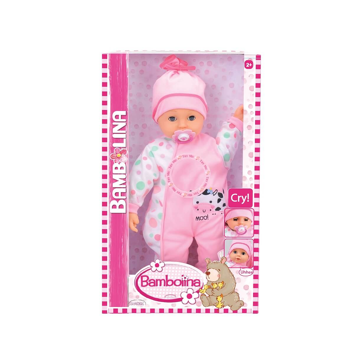 Lala Bambolina jest ubrana w różowe śpioszki i czapeczkę. Ma miękki brzuszek, jej oczy otwierają się i zamykają. Lala płacze jak niemowlak, uspokaja się po podaniu smoczka.