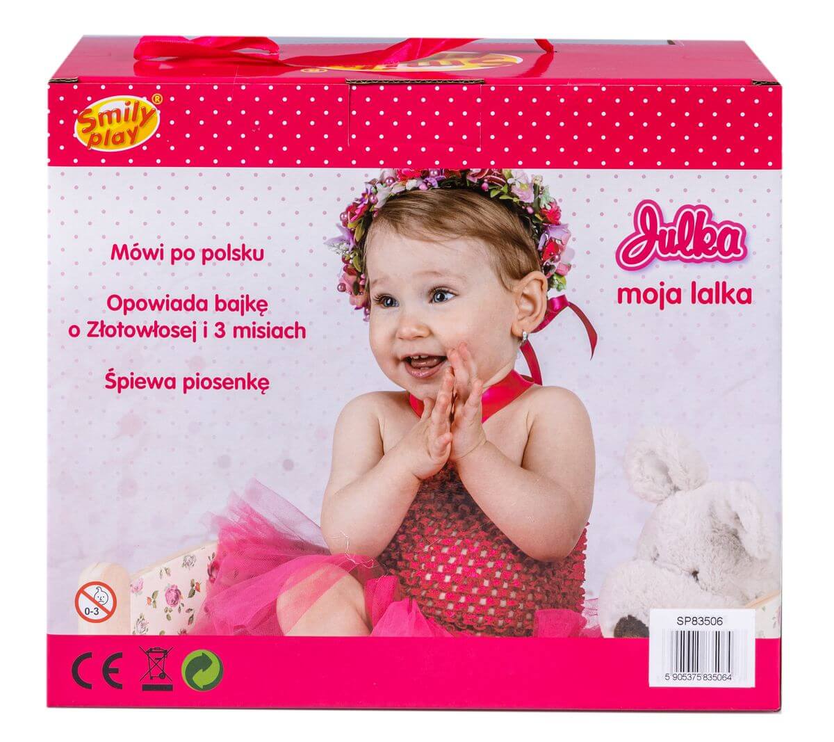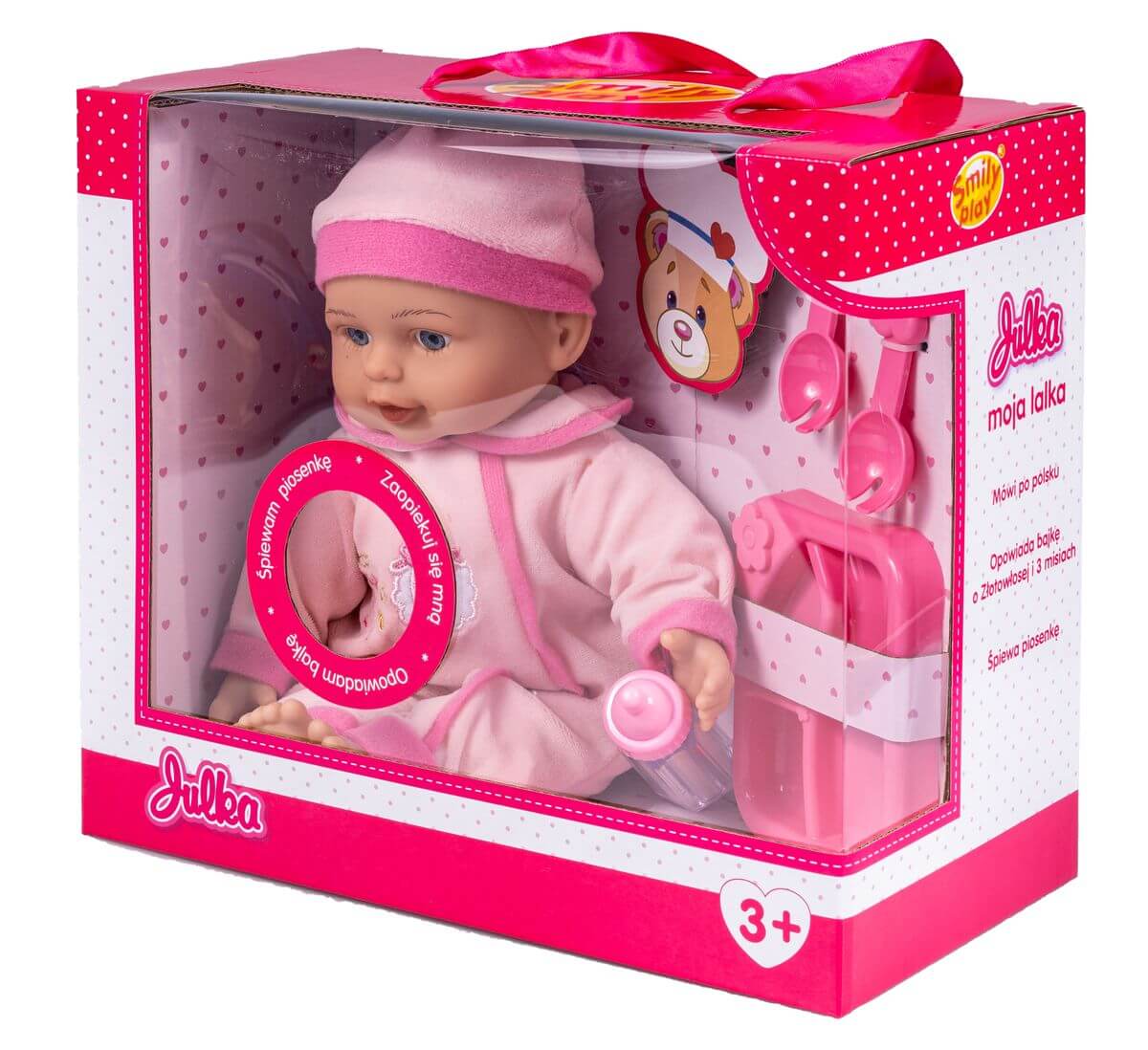Lalka Julka lubi, kiedy się nią opiekujesz i karmisz. Lalka jest ubrana w różowy pajacyk, ma finezyjny talerz z podziałką, sztućce i butelkę.