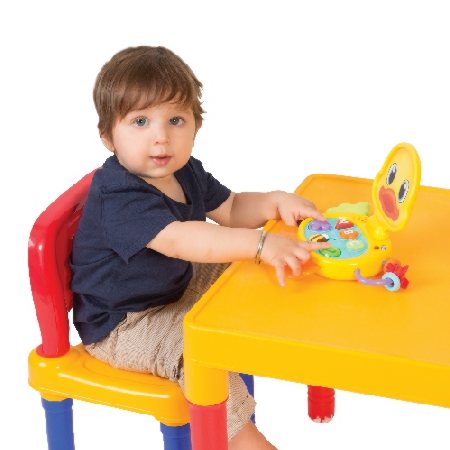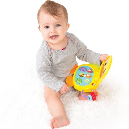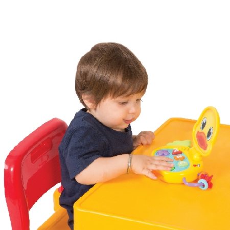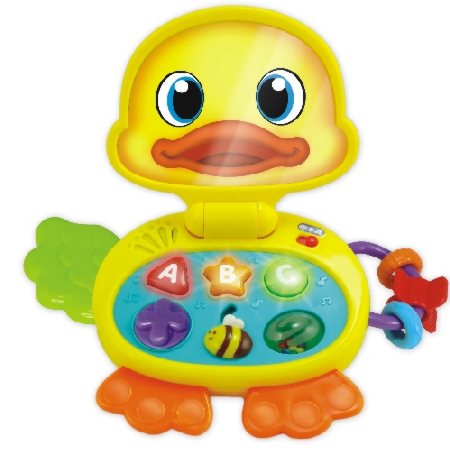Edukacyjny laptop wyglądem nawiązujący do ślicznej, żółtej i wesołej kaczuszki. Skierowany do maluszków powyżej 6 miesiąca życia. Zabawka jest interaktywna przez co doskonale wprowadzi maluszka w świat podstawowych kształtów i pierwszych liter alfabetu. Ma trzy przyciski funkcyjne oraz ruchome elementy do ćwiczenia małych paluszków naszego smyka.