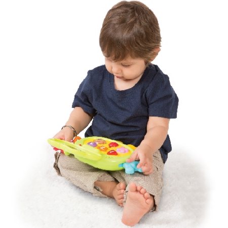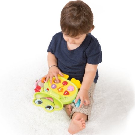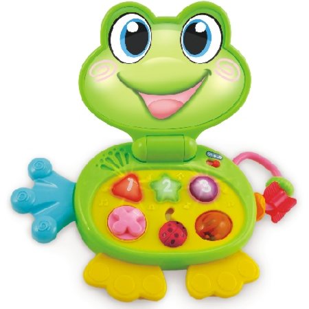 Edukacyjny laptop wyglądem nawiązujący do ślicznej, zieloniutkiej i wesołej żabki. Skierowany do maluszków powyżej 6 miesiąca życia. Zabawka jest interaktywna przez co doskonale wprowadzi maluszka w świat podstawowych kształtów i pierwszych liter alfabetu. Ma trzy przyciski funkcyjne oraz ruchome elementy do ćwiczenia małych paluszków naszego smyka.