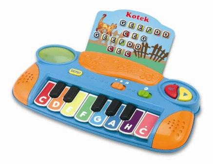 Pianinko edukacyjne to zabawka muzyczna. Jak się bawić? Po prostu grać dowolne melodie, nagrać swoją melodię i jej posłuchać. Posłuchać jednej z 10 popularnych piosenek (wystarczy włożyć specjalną kolorową kartę) i nauczyć się grać piosenki z "nut" na karcie. Pianinko nagrodzi trudy wielkimi owacjami!!!