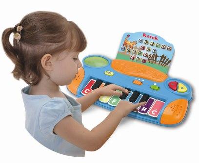Czy mając 2 lata można grać z nut? Oczywiście, że tak! Ale uwaga! To musi być łatwiejsze niż granie z nut umieszconych na pięciolinii. W zabawce zastosowano zapis nut kolorami i literkami. A piosenki są znane dzieciom i niezbyt trudne: