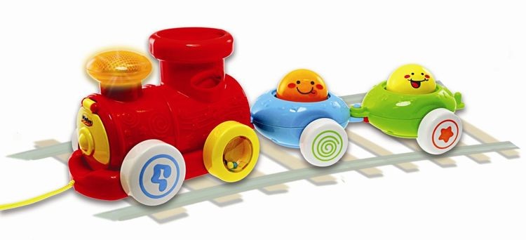 Lokomotywka Puff Puff to wesoły, muzyczny pojazd do ciągnięcia. Jest zabawką przeznaczoną dla maluchów w wieku powyżej 12 miesiąca życia. Dzięki specjalnemu czujnikowi każde pociągnięcie za sznureczek uruchamia wesołe dźwięki, którym towarzyczą rytmiczne efekty świetlne. Ponadto w zestawie znajdują sie trzy kolorowe piłeczki. Doskonale pasują do górnego otworu lokomotywki. Wrzuć jedną do środka i spójrz jak zachowa się ciuchcia - jej komin zacznie świecić, podczas gdy ona będzie wydawać zabawne dźwięki. Otwierając żółtą klapkę można je wyjąć z wnętrza pociągu. A do bezpiecznego transportu tych plastikowych kulek z zestawu, podczas zabawy, idealnie nadają się dwa kolorowe wagoniki. Można je doczepiać do lokomotywy w dowolnej kolejności.