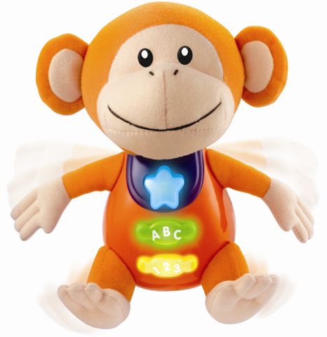 Małpka Fik-Mik która na swoim brzuszku posiada trzy kolorowe przyciski funkcyjne, które uruchamiają różne melodie oraz uczą dzieci podstawowych cyfr i liter. Dodatkowo posiada mięciutką główkę i szeleszczące stópki.