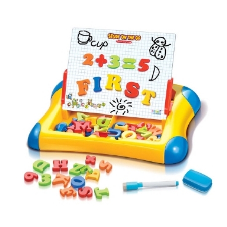 Z cyferek można układać równania matematyczne np. 2+3=5 Opływowe kształty i uchwyt ułatwiają stabilne trzymanie tablicy. Podczas zabawy, powierzchnie pisania możemy ustawić na dwa sposoby: położyć na płasko, lub pod skosem (dzięki specjalnym uchwytom). Wnętrze tablicy, pod powierzchnią pisania zajmują przegródki przygotowane specjalnie do przechowywania symboli magnetycznych. Dzięki takiemu rozwiązaniu dziecko chętnie posprząta po zabawie.