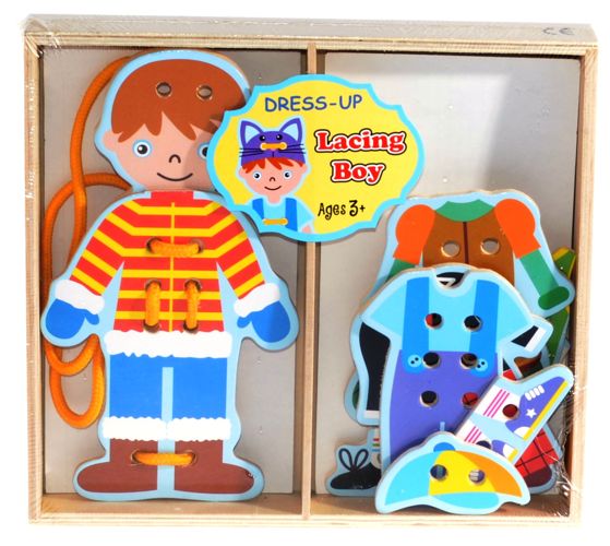 W drewnianym pudełku znajdziesz kilka strojów, które możesz ze sobą skompletować. Jeśli już zdecydujesz się w co chcesz ubrać chłopca, wystarczy, że wszystko połączysz sznurkiem. Zabawka ćwiczy zdolności manulne dziecka.