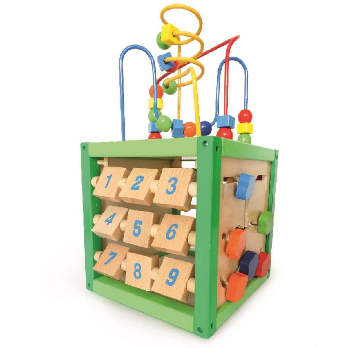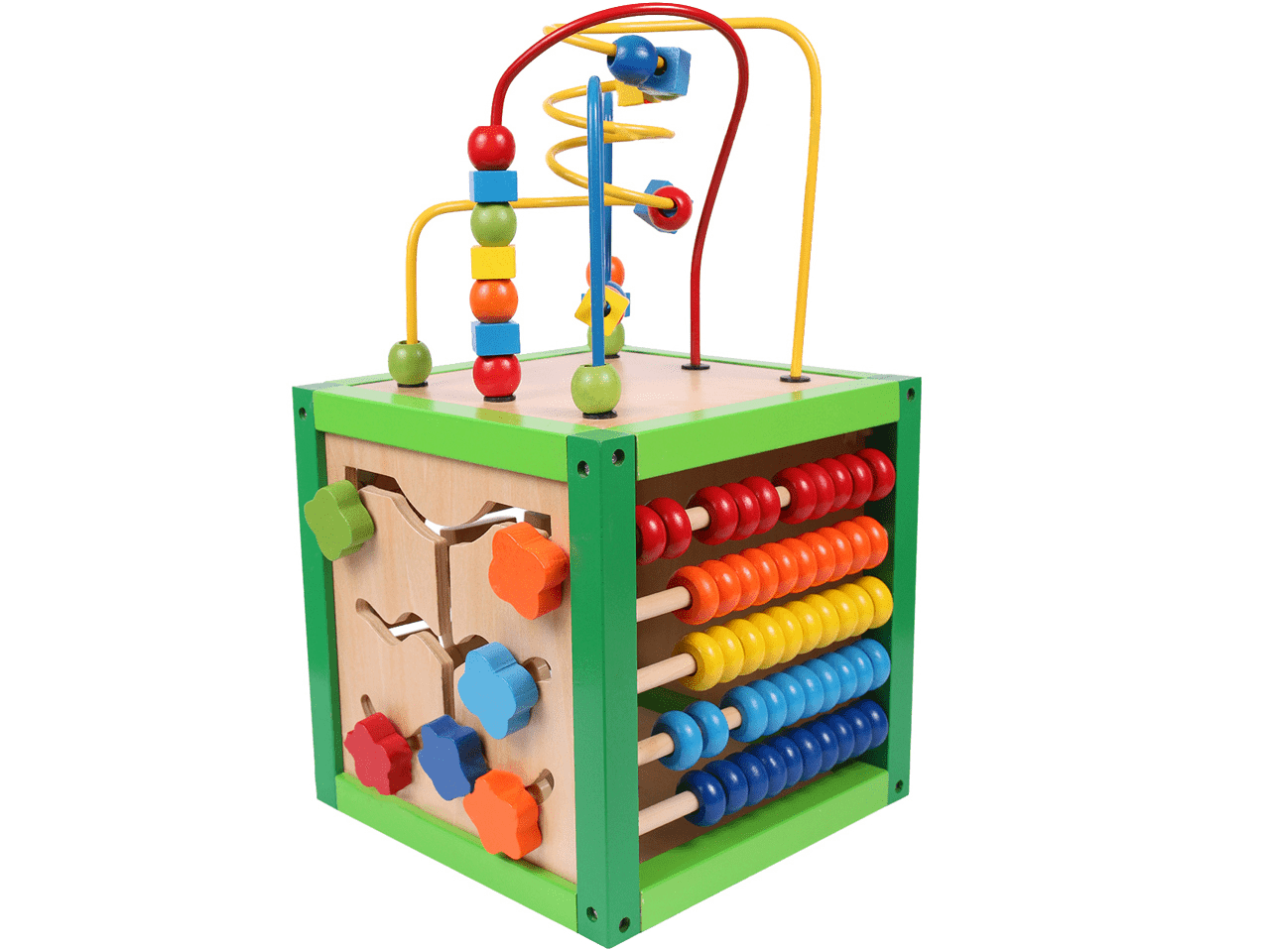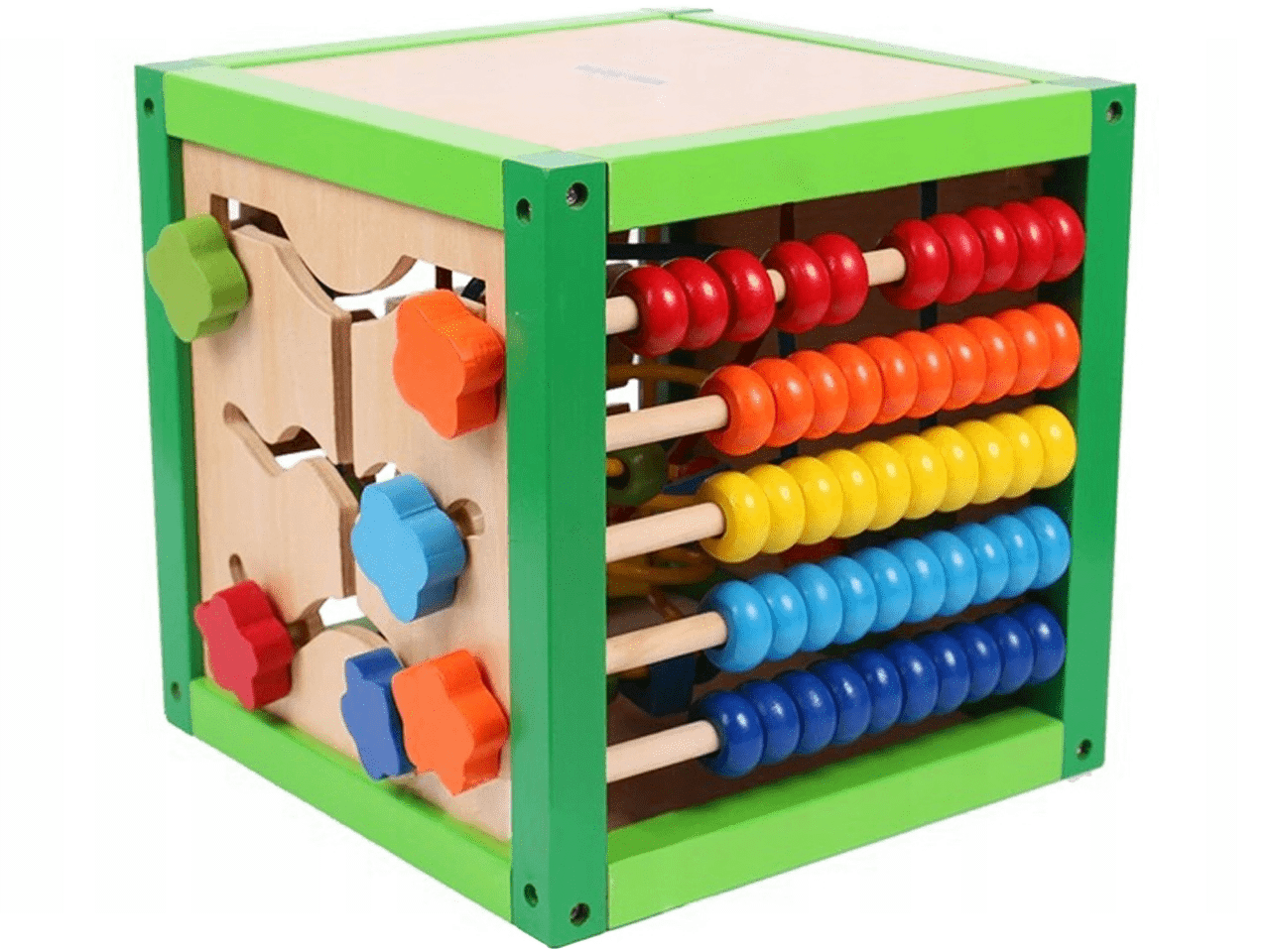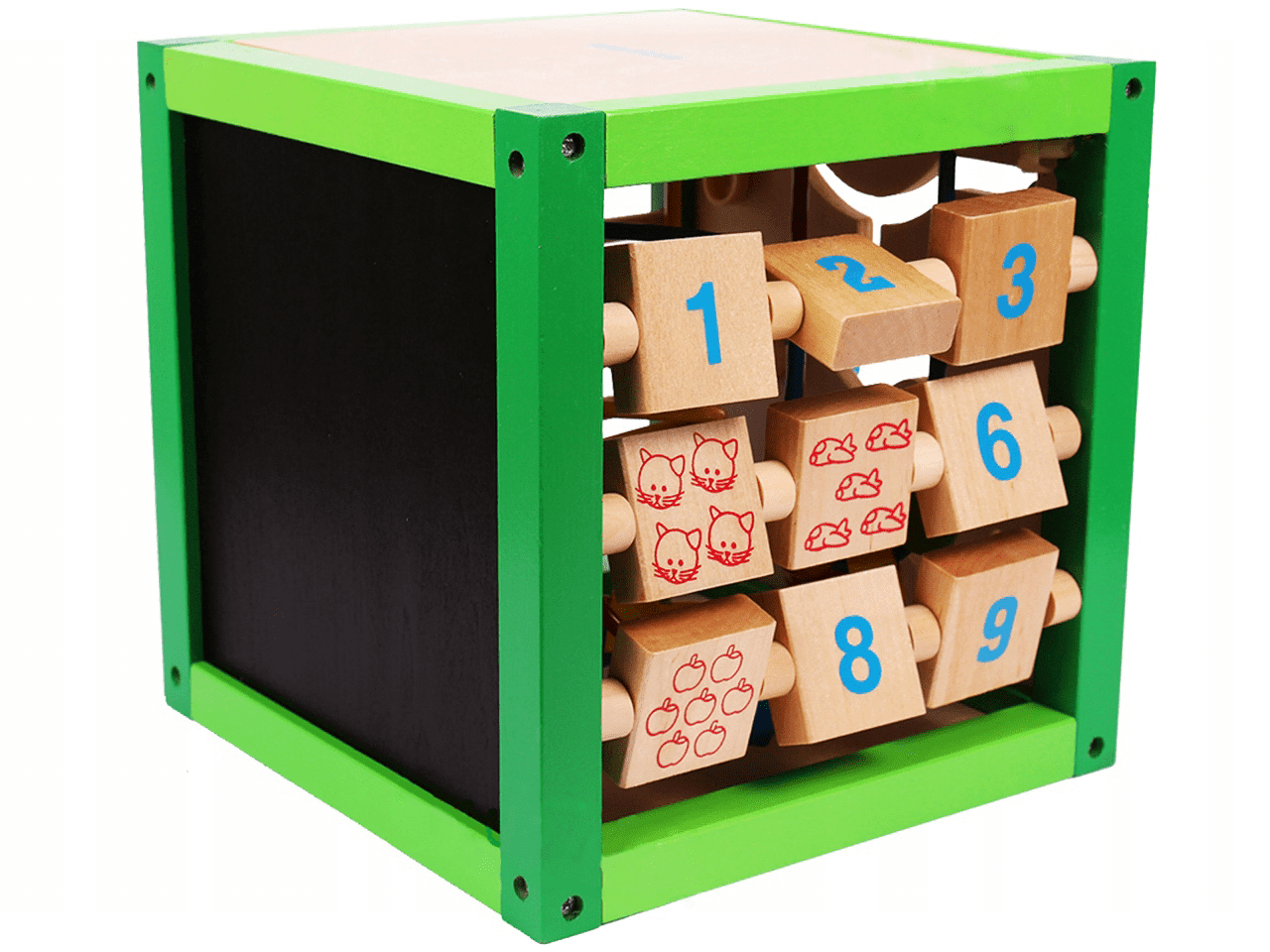 Jak umieścić razem wybrane klocki albo zmienić ich kolejność? Rozwiązanie zadania wymaga różnorodnych ruchów po torach. To dodatkowo ćwiczenie poprawiające sprawność dłoni. Kolorowe liczydło i przekręcane klocki z cyferkami pomogą maluchowi w nauce liczenia, a później także dodawania. Na jednej ze ścianek pudełka jest tablica. Wystarczy kawałek kredy, by dziecko mogło napisać do mamy dziecięcy list lub napisać, jak bardzo ją kocha.