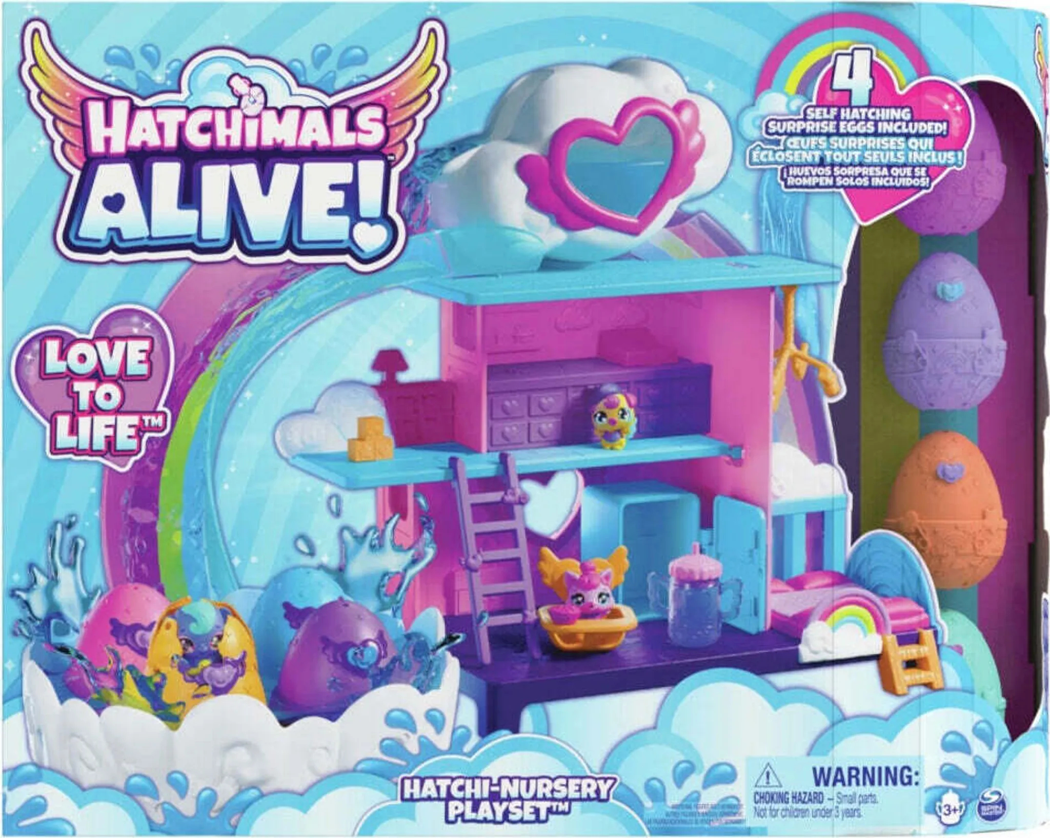 Baw się, wykluwaj i pielęgnuj dzięki zestawowi Hatchimals Alive Hatchi-Nursery Playset! Dzięki Twojej miłości i trosce postacie Hatchimals Alive ożywają w nowy sposób. Ten zabawny zestaw zawiera cztery jajeczka, które wykluwają się po aktywacji wodą! Cztery urocze Hatchimals przebiją się przez jajka w kilka sekund!