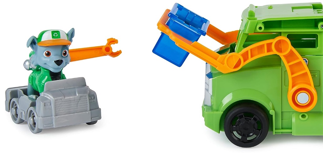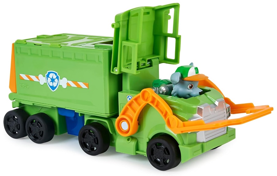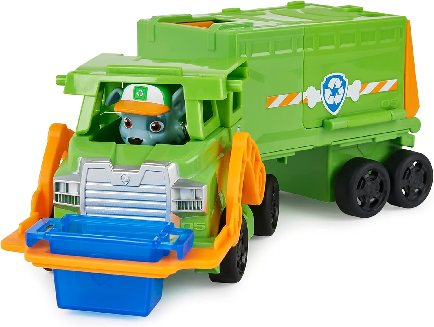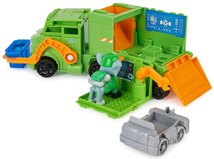 Wyrusz na ratunek z drużyną przesympatycznych szczeniaków. Zestaw zawiera wyjątkowy pojazd oraz figurkę szczeniaka Rocky. Ciężarówka do recyklingu posiada ruchome koła, które pozwalają na poruszanie się po powierzchniach płaskich. Duża ciężarówka Rocky'ego szybko zmienia się w tryb centrum dowodzenia. Dach szoferki jest otwierany i można w nim umieścić bohaterskiego pieska. Z przodu pojazdu znajduje się znajduje się ruchome ramię, dzięki któremu pojemnik z odpadami można umieścić w kontenerze. Kontener ma otwieraną tylną klapę, otwierana jest także góra kontenera. W zestawie znajduje się dodatkowo mały pojazd oraz figurka Rocky. Piesek ubrany jest w zielony kubraczek z plecakiem oraz zieloną czapkę. Zestaw z całą pewnością spodoba się każdemu miłośnikowi perypetii grupy bohaterskich szczeniaków z serii Psi Patrol.