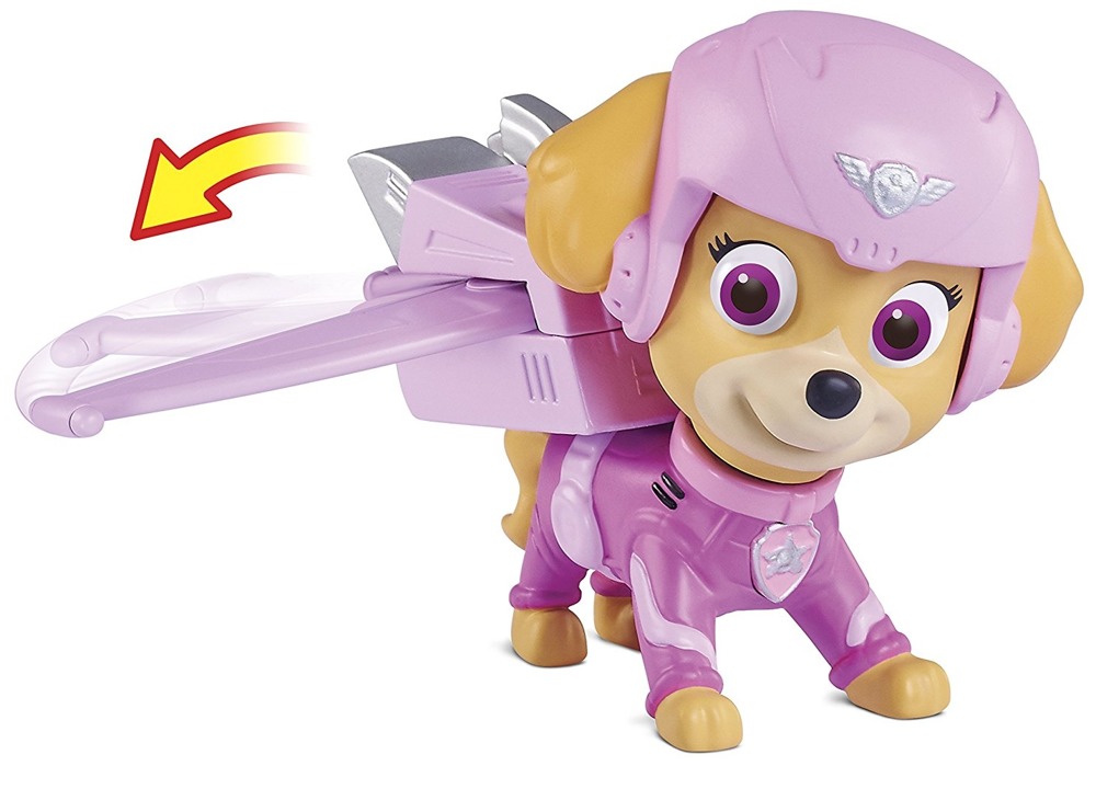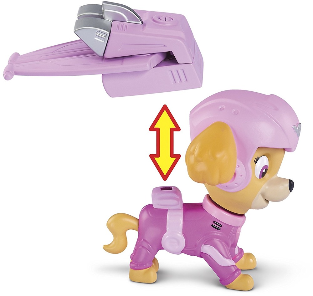 Figurka ma ruchomą głowę i specjalny przycisk - odznakę na obroży, który aktywuje odrzutowiec umieszczony na grzbiecie suczki.