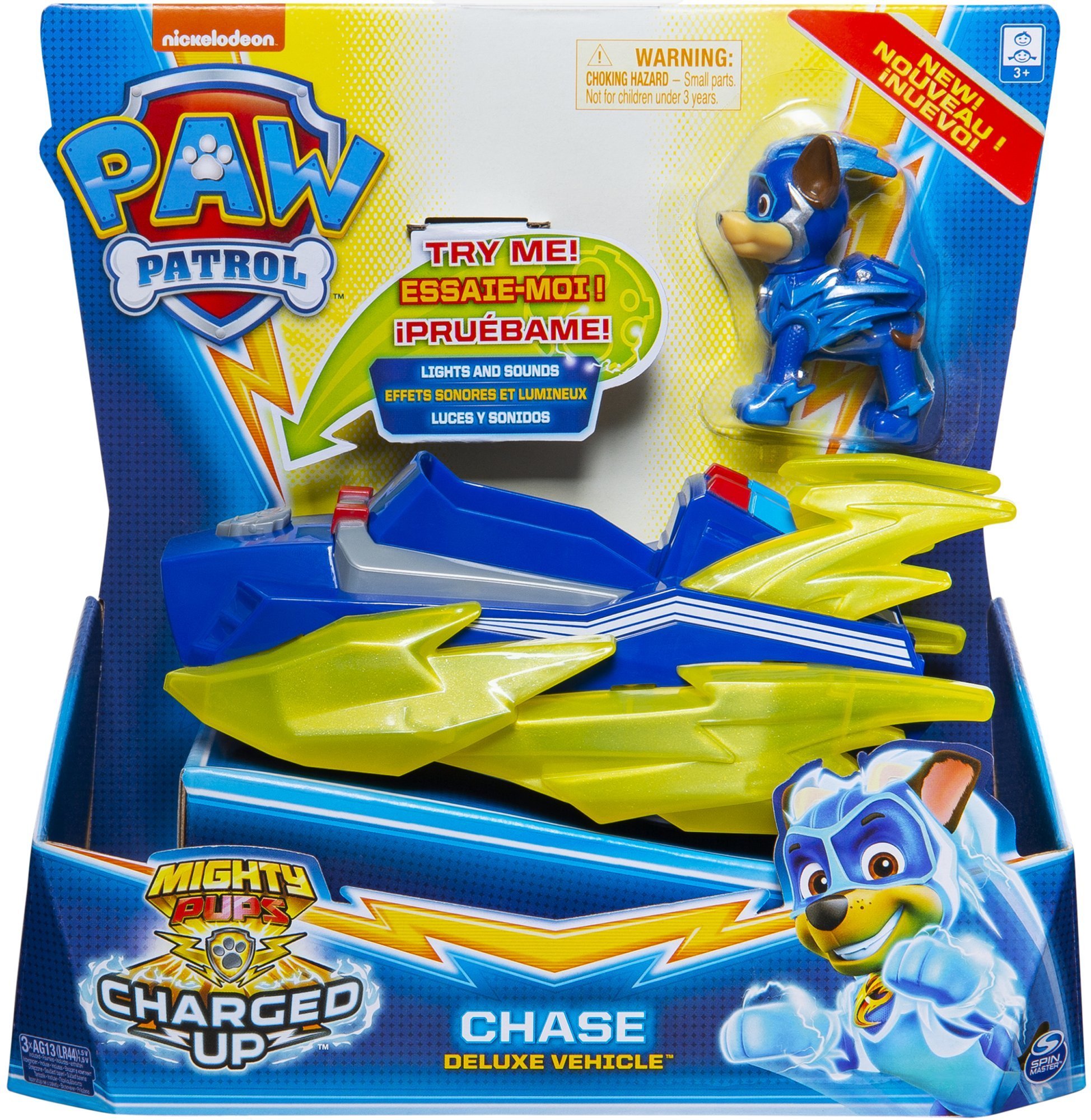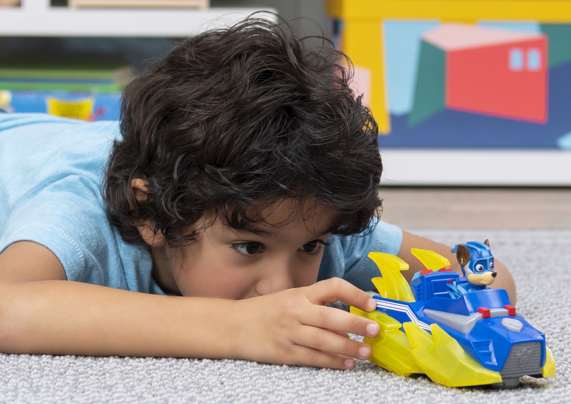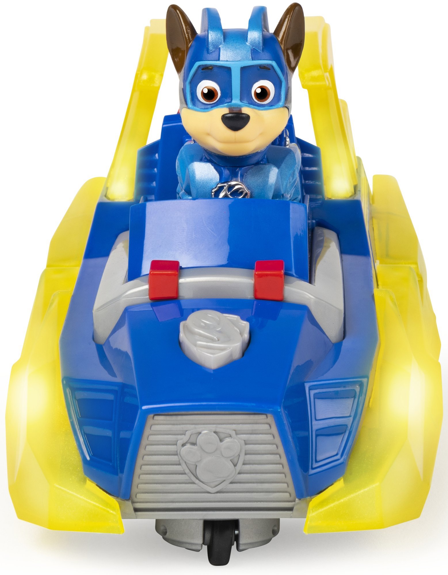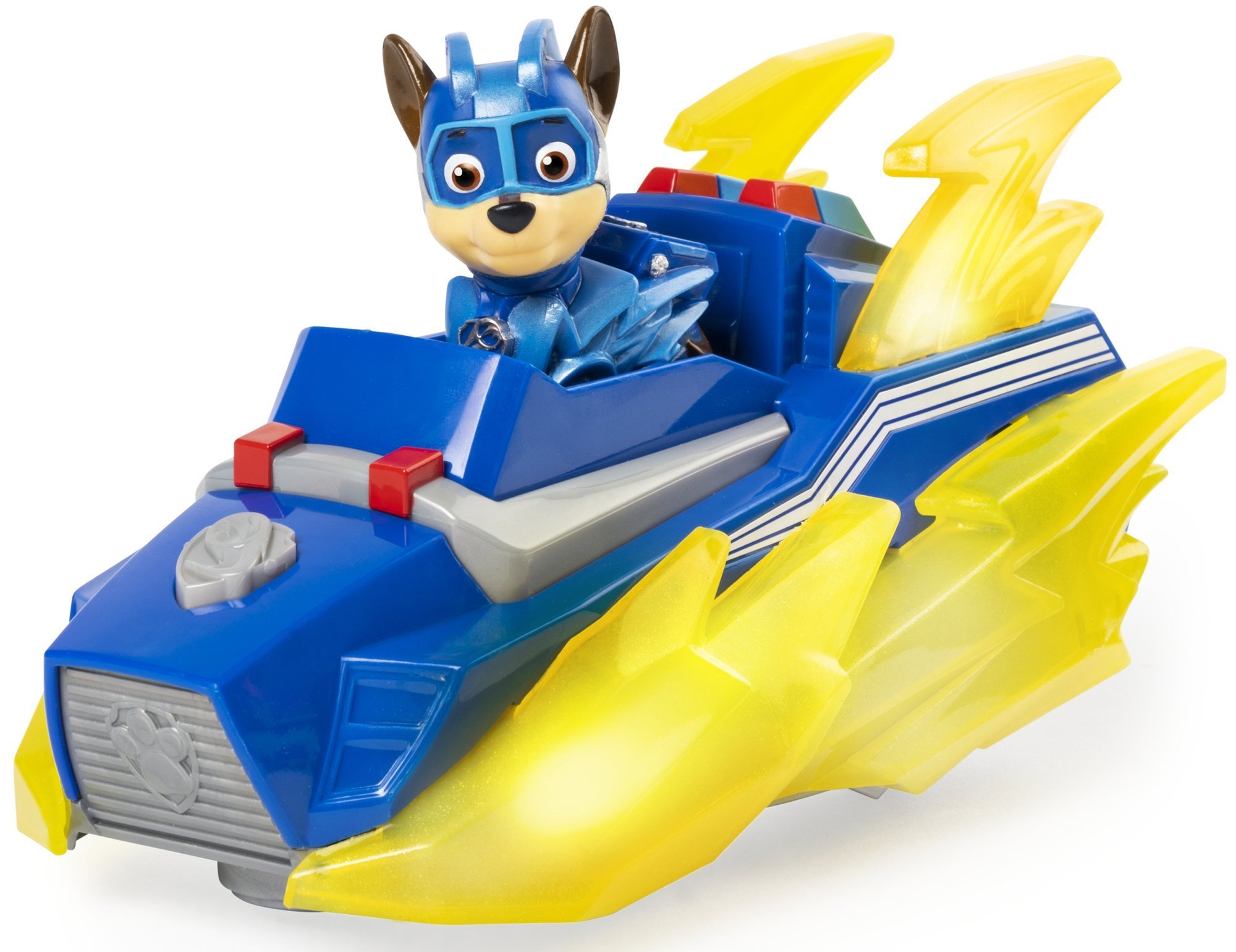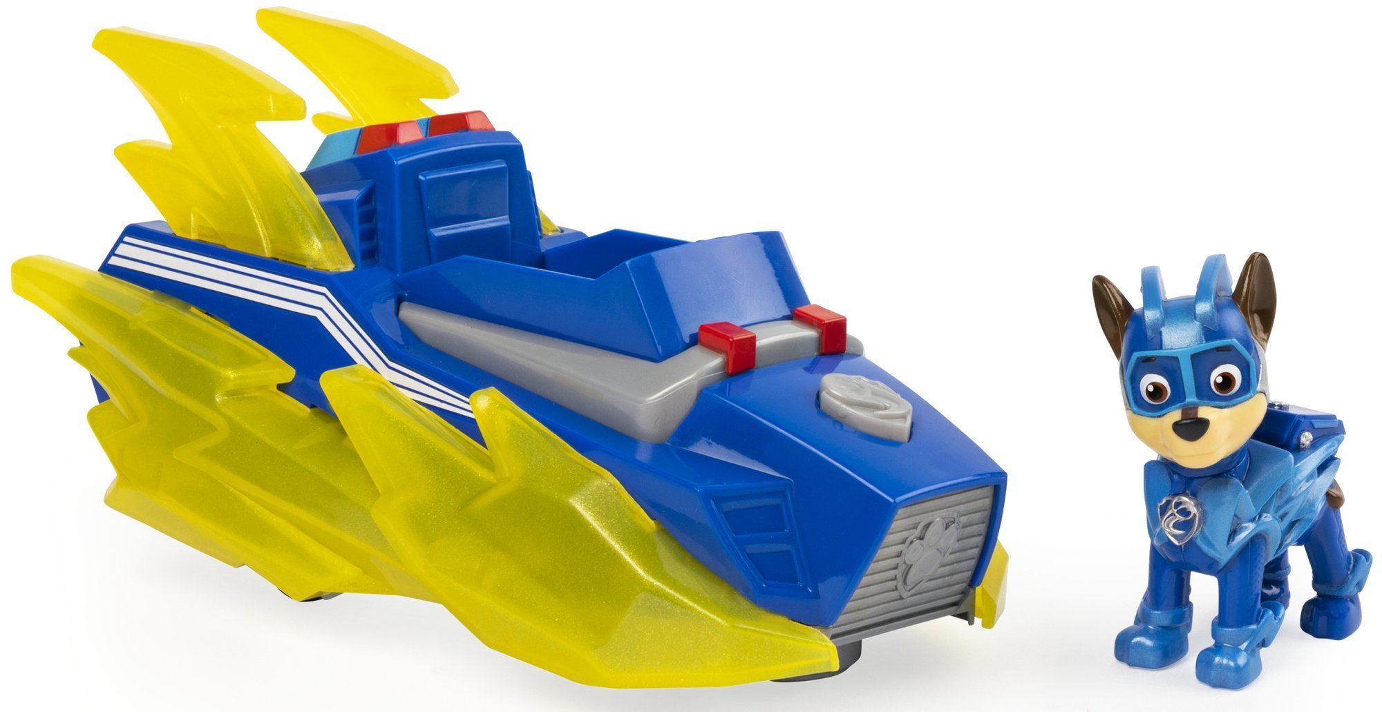 Wyrusz na ratunek z drużyną przesympatycznych szczeniaków. Zestaw zawiera wyjątkowy pojazd oraz figurkę szczeniaka. Trójkołowy niebiesko- żółty radiowóz, którego zdobią świecące błyskawice, posiada efekty świetlne i dźwiękowe. Po kliknięciu na odznakę psiego patrolu z pojazdu wydobywają się dźwięki syreny policyjnej jak i dźwięki wskazujące na supermoc bohaterskiego psiaka. Wraz z dziękami błyskawice zaczynają świecić intensywnym światłem. Pojazd posiada 3 koła. Figurkę pieską można wyjąć z pojazdu i bawić się nią osobno. Chase ubrany jest w wyjątkowy niebieski kubraczek oraz kosmiczny kaski. Zestaw z całą pewnością spodoba się każdemu miłośnikowi perypetii grupy bohaterskich szczeniaków z serii Psi Patrol.
