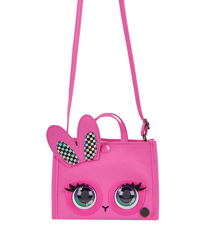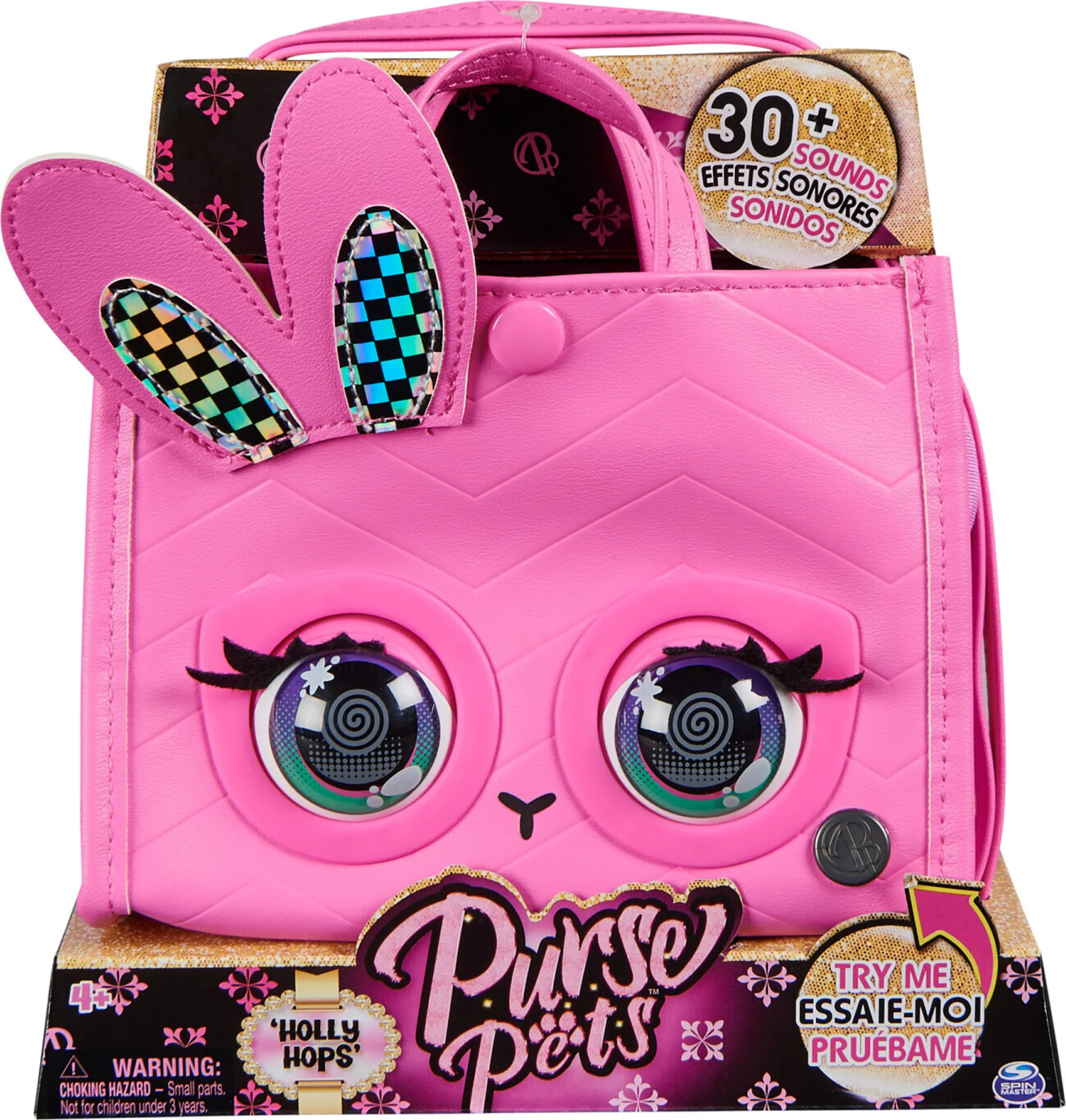Małe interaktywne torebeczki - urocze zwierzątka to coś o czym każda mała dziewczynka marzy. Wyjątkowe torebki reagują na dotyk, naprawdę mrugają i mają ponad 30 ekscytujących dźwięków i reakcji unikalnych dla każdego stylu Purse Pet! Holly Hops ma różowy wzorzysty materiał, holograficzne uszy króliczka w kratę, oczy inspirowane pop-artem i zapięcie na zatrzask. Dzięki podwójnym paskom możesz nosić Holly Hops za uchwyty lub przedłużyć dłuższy pasek do długości 100 cm i nosić ją jako torbę na ramię! Dotknij jej głowy, aby usłyszeć słodkie odgłosy i mruczenie. Przytrzymaj jej czoło i otrzymaj buziaka!