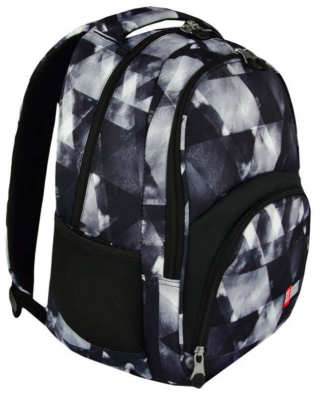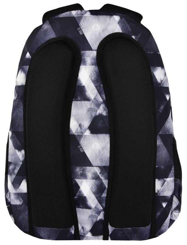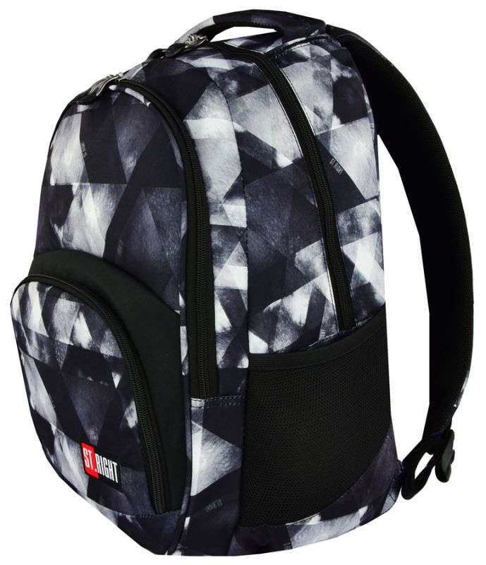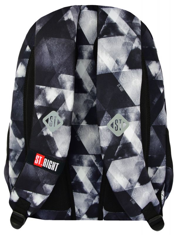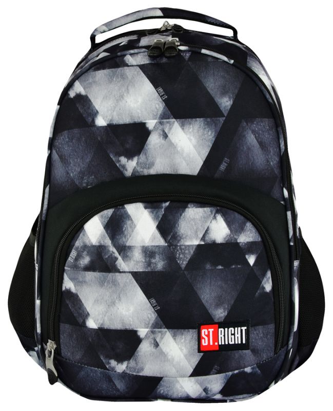 Plecak St.Right BP27 Watercolour - czarno biały print, abstrakcja osób, które wolą standardowe barwy, czyli głównie czerń, szarości i nieco bieli. Modny, abstrakcyjny wzór w figury geometryczne - przenikające się pasy tworzą trójkąty i romby. Cieniowane figury jakby malowane akwarelą - nietuzinkowy, wyjątkowy, a jednocześnie praktyczny wzór plecaka.