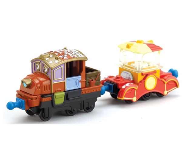Lokomotywa Hugo z wagonikiem z popcornem. Hugo to pojazd zbudowany z części ciężarówki i lokomotywy. Jest młodą lokomotywą i przyjaźni się z Edim, z którym wspólnie z nim rozwiązuje wszystkie problemy. Lokomotywy pasują do torów z serii RC2 Take Along „Tomek i Przyjaciele”.