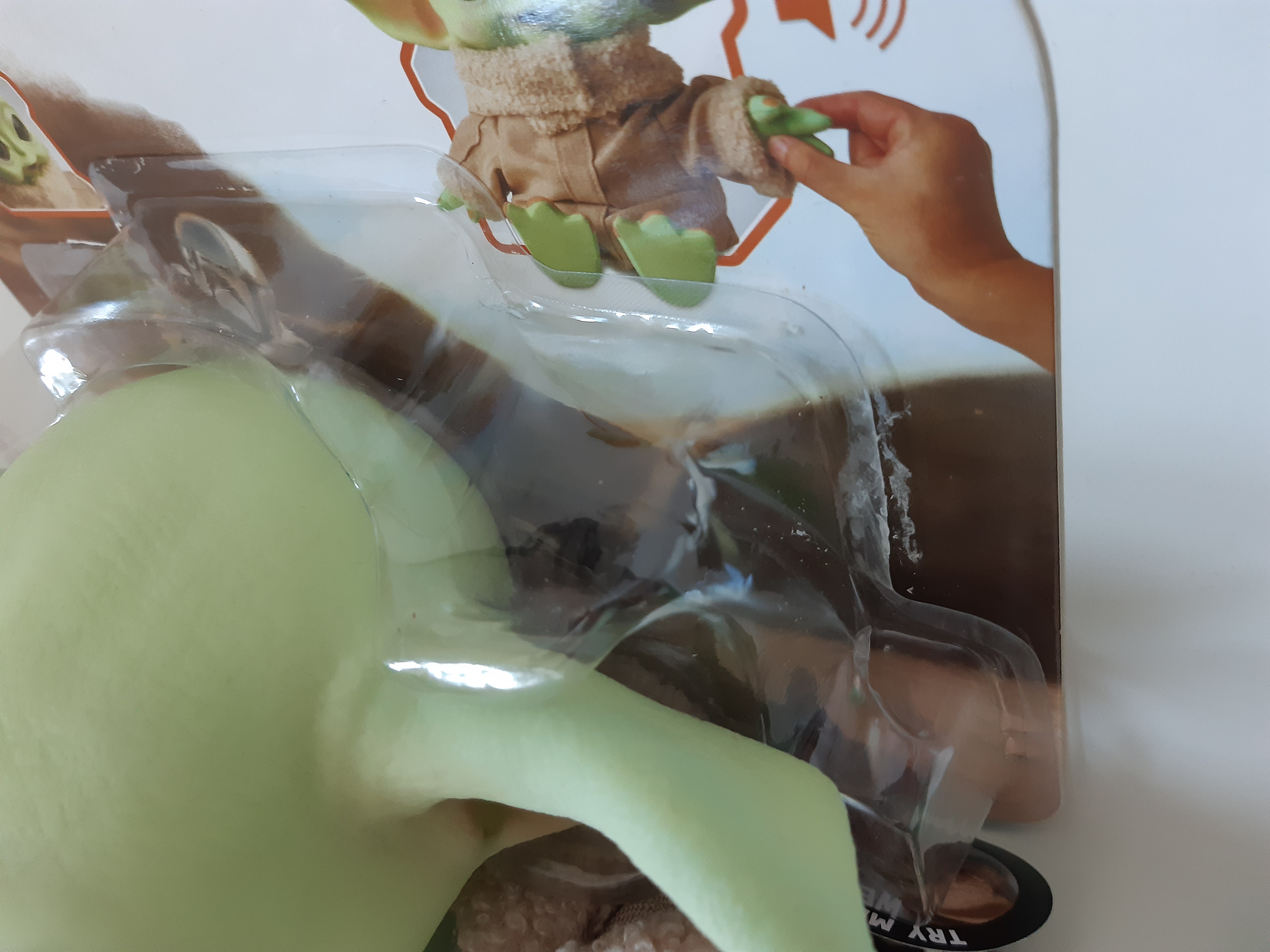 Interaktywna maskotka ma około 28 cm wzrostu. Jej głowa wykonana jest z gumowego miłego w dotyku materiału przypominającego skórę. Jej duże czarne oczy są plastikowe. Maskotka ma również bardzo długie i rozpoznawalne dla fanów uszy. Reszta tułowia jest zrobiona z materiału wypełnionego miękkim wypełniaczem. Baby Yoda ubrany jest w jutowy płaszczyk. W zestawie znajduje się plecak, w którym możesz przetransportować małego Yodę gdzie tylko zechcesz. Naciśnij na dłoń maskotki maskotki, aby usłyszeć radosne dźwięki, jakie wydaje.