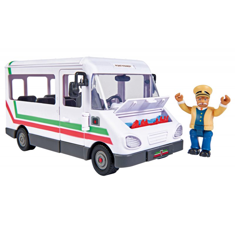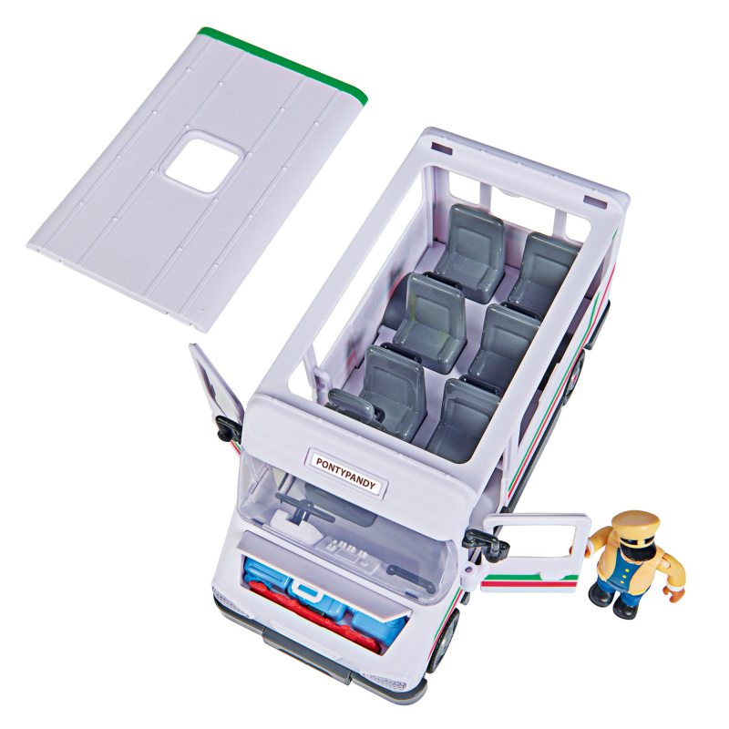 Strażak Sam Autobus Trevora z figurką i akcesoriami to zestaw dla miłośników bajki o dzielnym strażaku Samie. Zestaw zawiera biały autobus ozdobiony czerwonym i zielonym paskiem idącym wzdłuż pojazdu. Pojazd posiada miejsce dla kierowcy i 6 pasażerów, otwierane drzwi i maskę ze schowkiem na akcesoria oraz zdejmowany dach, dzięki czemu w łatwy sposób możemy umieścić inne figurki w pojeździe (sprzedawane oddzielnie). Zmieniając ustawienie kół można ustawić pojazd by poruszał się prosto lub z zabawny trzęsący sposób.