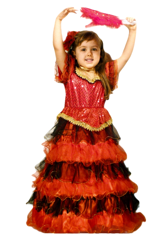 W skład stroju wchodzi: długa suknia z falbanami i zdobieniami