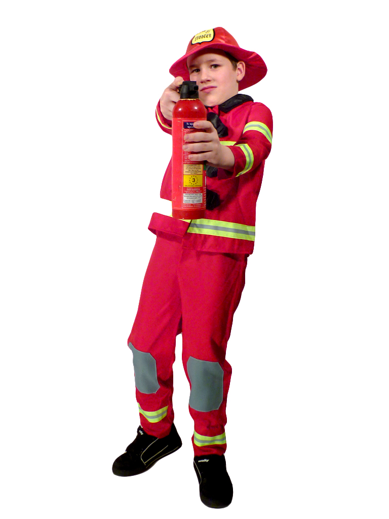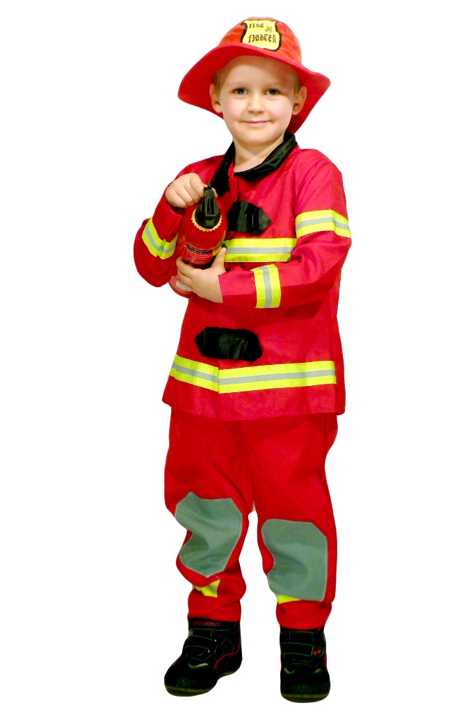 W skład stroju wchodzi: kombinezon strażacki, czapka strażacka